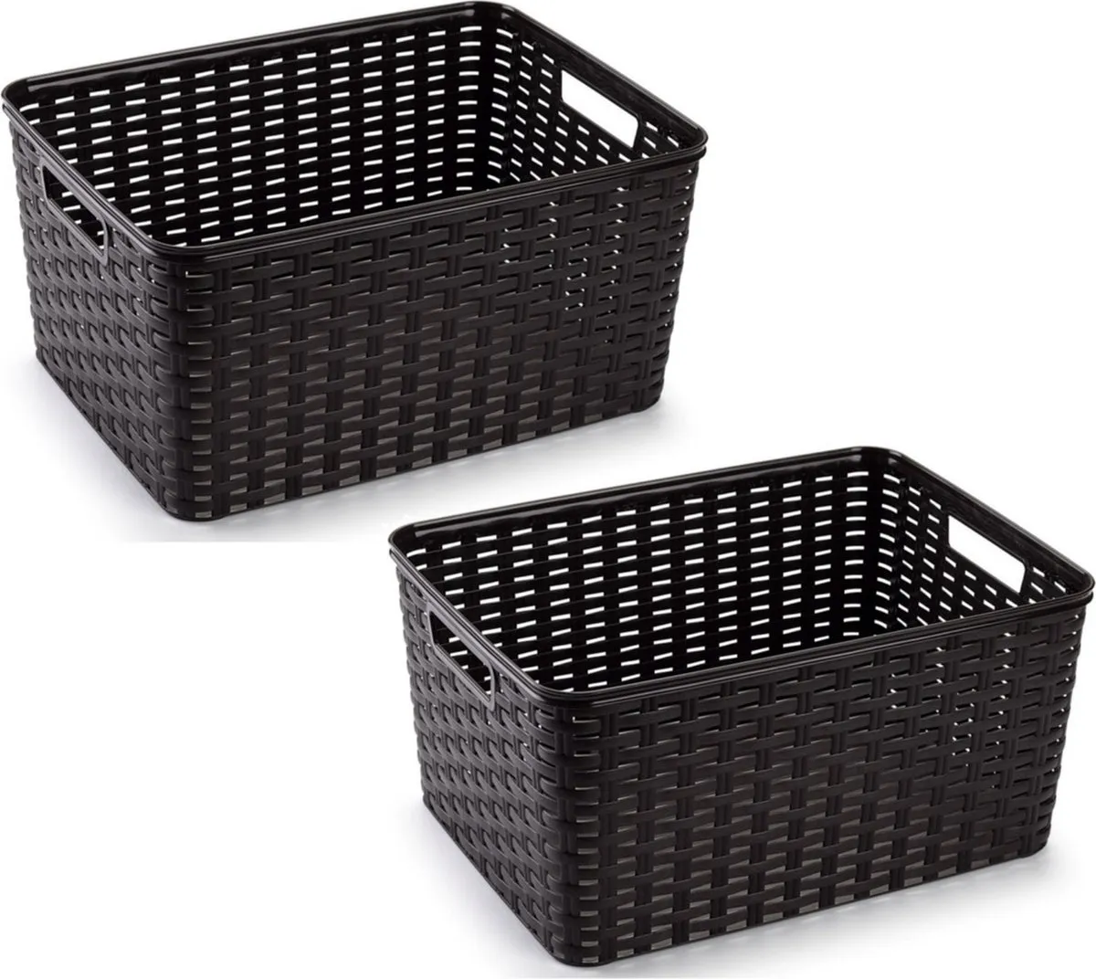 12x Antraciet grijze geweven opbergboxen/opbergdozen/opbergmanden 18 liter kunststof. Door het aantrekkelijke geweven design en de luxe uitstraling van de boxen zijn deze opbergboxen/opbergdozen prima geschikt om in de woonkamer of slaapkamer plaatsen. Deze box is bijvoorbeeld geschikt voor het opbergen van rondslingerend speelgoed, breiwerkjes of het opbergen van boeken. Ook ideaal voor in de badkamer of in de voorraadkast. De mand heeft handgrepen waardoor je ze gemakkelijk kunt dragen. Formaat: ongeveer 38,5 x 28,5 x 19 cm. Materiaal: kunststof. Aantal boxen: 12x. Deksel: geen. Inhoud: ca. 18 liter. Kleur: antraciet grijs. Opbergdozen/opbergboxen/manden voor het opbergen van spullen.