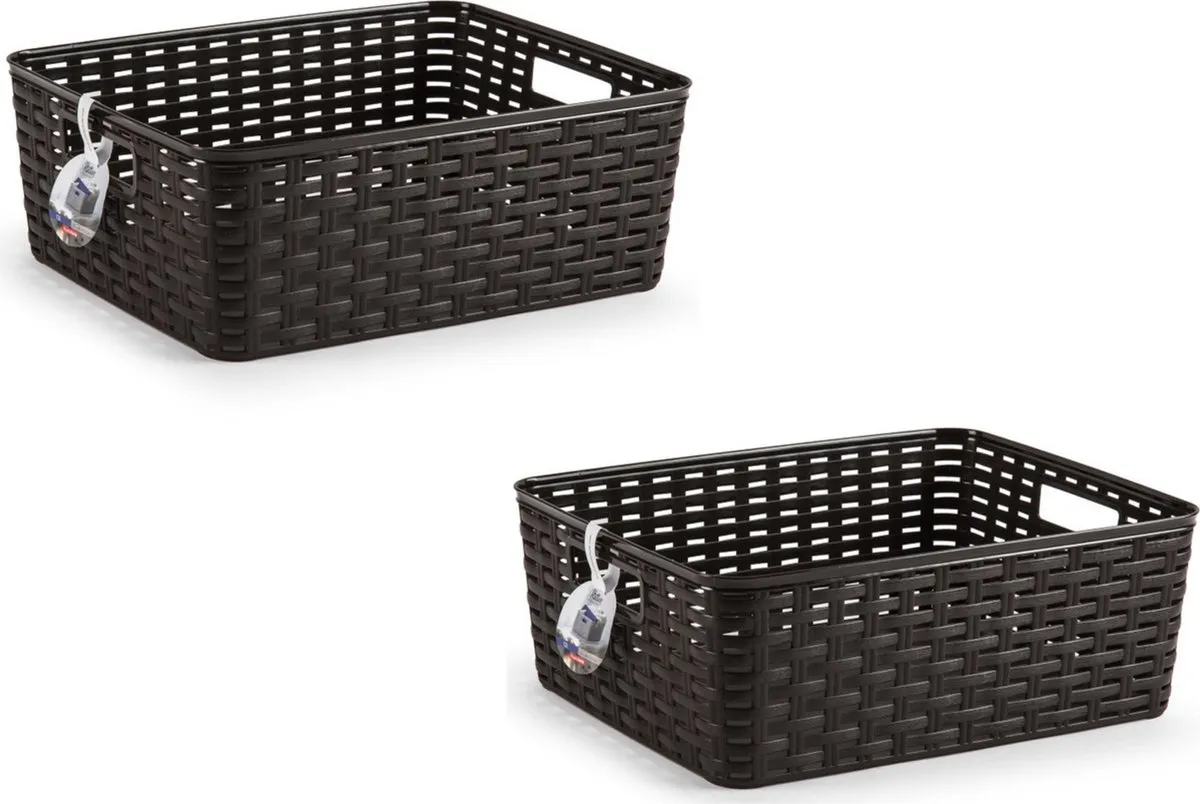 2x Antraciet grijze geweven opbergboxen/opbergdozen/opbergmanden 12 liter kunststof. Door het aantrekkelijke geweven design en de luxe uitstraling van de boxen zijn deze opbergboxen/opbergdozen prima geschikt om in de woonkamer of slaapkamer plaatsen. Deze box is bijvoorbeeld geschikt voor het opbergen van rondslingerend speelgoed, breiwerkjes of het opbergen van boeken. Ook ideaal voor in de badkamer of in de voorraadkast. De mand heeft handgrepen waardoor je ze gemakkelijk kunt dragen. Formaat: ongeveer 36 x 28 x 13,5 cm. Materiaal: kunststof. Aantal boxen: 2x. Deksel: geen. Inhoud: ca. 12 liter. Kleur: antraciet grijs. Opbergdozen/opbergboxen/manden voor het opbergen van spullen.