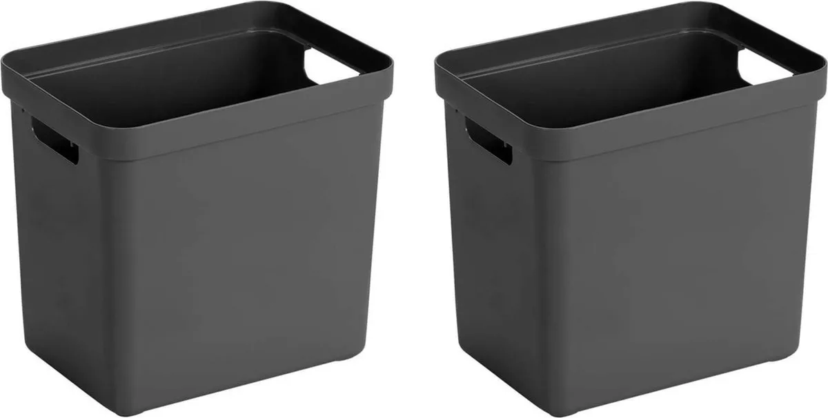 2x Antraciet grijze opbergboxen/opbergdozen/manden 25 liter kunststof. Door het moderne design en de luxe uitstraling van de boxen kun je deze opbergboxen/opbergdozen prima in de woonkamer of slaapkamer plaatsen. Deze box is bijvoorbeeld geschikt voor het opbergen van rondslingerend speelgoed, breiwerkjes of het opbergen van boeken. Ook ideaal voor in de badkamer of in de voorraadkast. De mand heeft handgrepen waardoor je ze gemakkelijk kunt dragen. Formaat: ongeveer 35 x 25 x 36,3 cm. Materiaal: kunststof. Aantal boxen: 2x. Deksel: geen. Inhoud: ca. 25 liter. Kleur: antraciet grijs. Opbergdozen/opbergboxen/manden voor het opbergen van spullen.