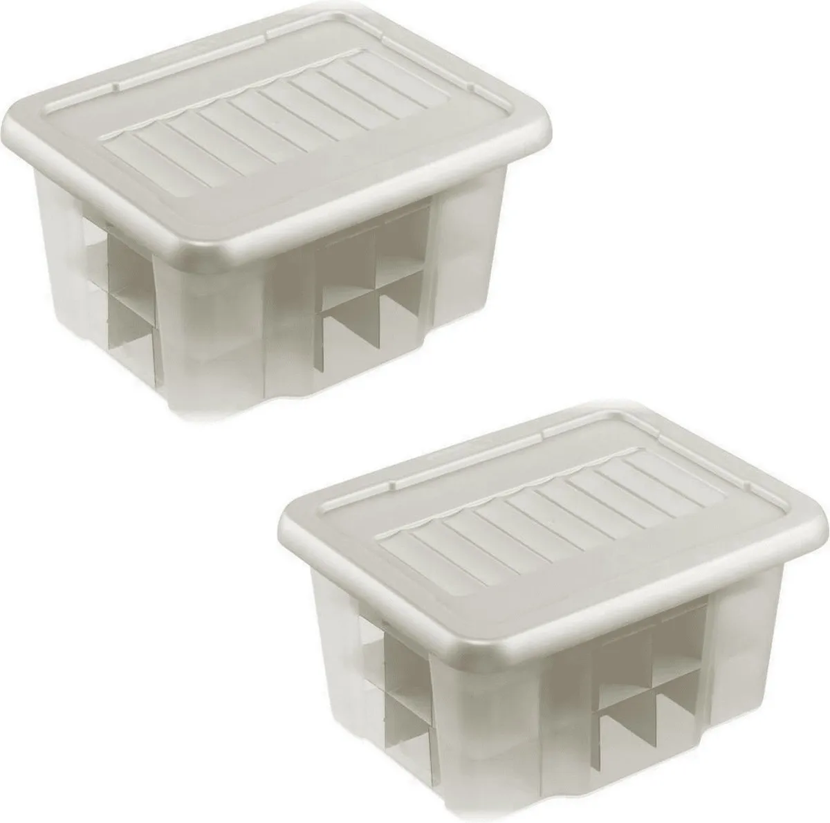 2x Kerstballen/kerstversiering opruimen opbergboxen voor 45 kerstballen 24 Liter. Kunststof opbergboxen voor het vocht- en stofvrij opbergen van kerstballen. Deze box wordt geleverd inclusief speciale kartonnen trays waarin 45 kerstballen per box opgeborgen kunnen worden. De trays zijn makkelijk in elkaar te zetten en perfect te stapelen in de box. De deksel van de box is wit. Buiten formaat: 43 x 34,5 x 22,5 cm. Materiaal: kunststof. U ontvangt 2 boxen. Kerstversiering/kerstdecoratie en kerstballen opbergen/opruimen.