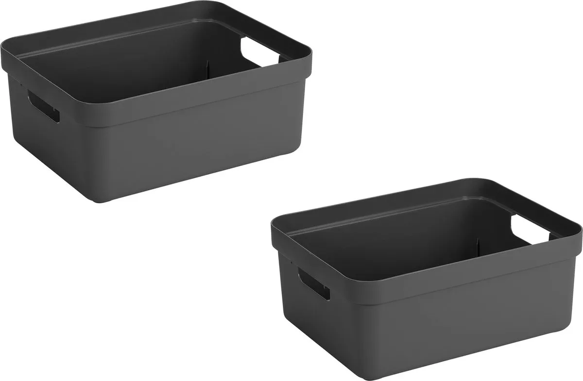 2x stuks antraciet grijze opbergboxen/opbergdozen/opbergmanden 24 liter kunststof. Door het moderne design en de luxe uitstraling van de boxen kun je deze opbergboxen/opbergdozen prima in de woonkamer of slaapkamer plaatsen. Deze box is bijvoorbeeld geschikt voor het opbergen van rondslingerend speelgoed, breiwerkjes of het opbergen van boeken. Ook ideaal voor in de badkamer of in de voorraadkast. De mand heeft handgrepen waardoor je ze gemakkelijk kunt dragen. Formaat: ongeveer 45,3 x 35,4 x 18,3 cm. Materiaal: kunststof. Aantal boxen: 2x. Deksel: geen. Inhoud: ca. 24 liter. Kleur: antraciet grijs. Opbergdozen/opbergboxen/manden voor het opbergen van spullen.