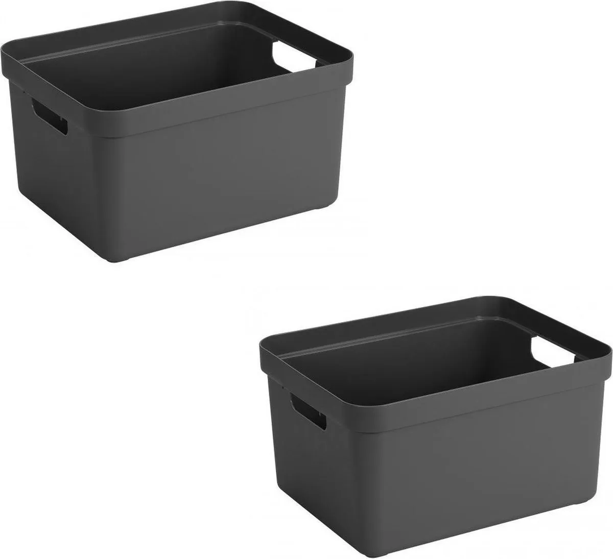 2x stuks antraciet grijze opbergboxen/opbergdozen/opbergmanden 32 liter kunststof. Door het moderne design en de luxe uitstraling van de boxen kun je deze opbergboxen/opbergdozen prima in de woonkamer of slaapkamer plaatsen. Deze box is bijvoorbeeld geschikt voor het opbergen van rondslingerend speelgoed, breiwerkjes of het opbergen van boeken. Ook ideaal voor in de badkamer of in de voorraadkast. De mand heeft handgrepen waardoor je ze gemakkelijk kunt dragen. Formaat: ongeveer 45,3 x 35,4 x 24,3 cm. Materiaal: kunststof. Aantal boxen: 2x. Deksel: geen. Inhoud: ca. 32 liter. Kleur: antraciet grijs. Opbergdozen/opbergboxen/manden voor het opbergen van spullen.