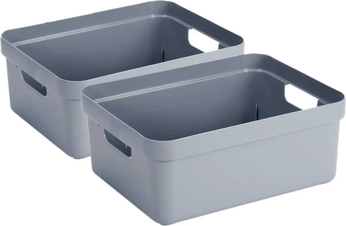 2x stuks donkerblauwe opbergboxen/opbergdozen/opbergmanden 24 liter kunststof. Door het moderne design en de luxe uitstraling van de boxen kun je deze opbergboxen/opbergdozen prima in de woonkamer of slaapkamer plaatsen. Deze box is bijvoorbeeld geschikt voor het opbergen van rondslingerend speelgoed, breiwerkjes of het opbergen van boeken. Ook ideaal voor in de badkamer of in de voorraadkast. De mand heeft handgrepen waardoor je ze gemakkelijk kunt dragen. Formaat: ongeveer 45,3 x 35,4 x 18,3 cm.