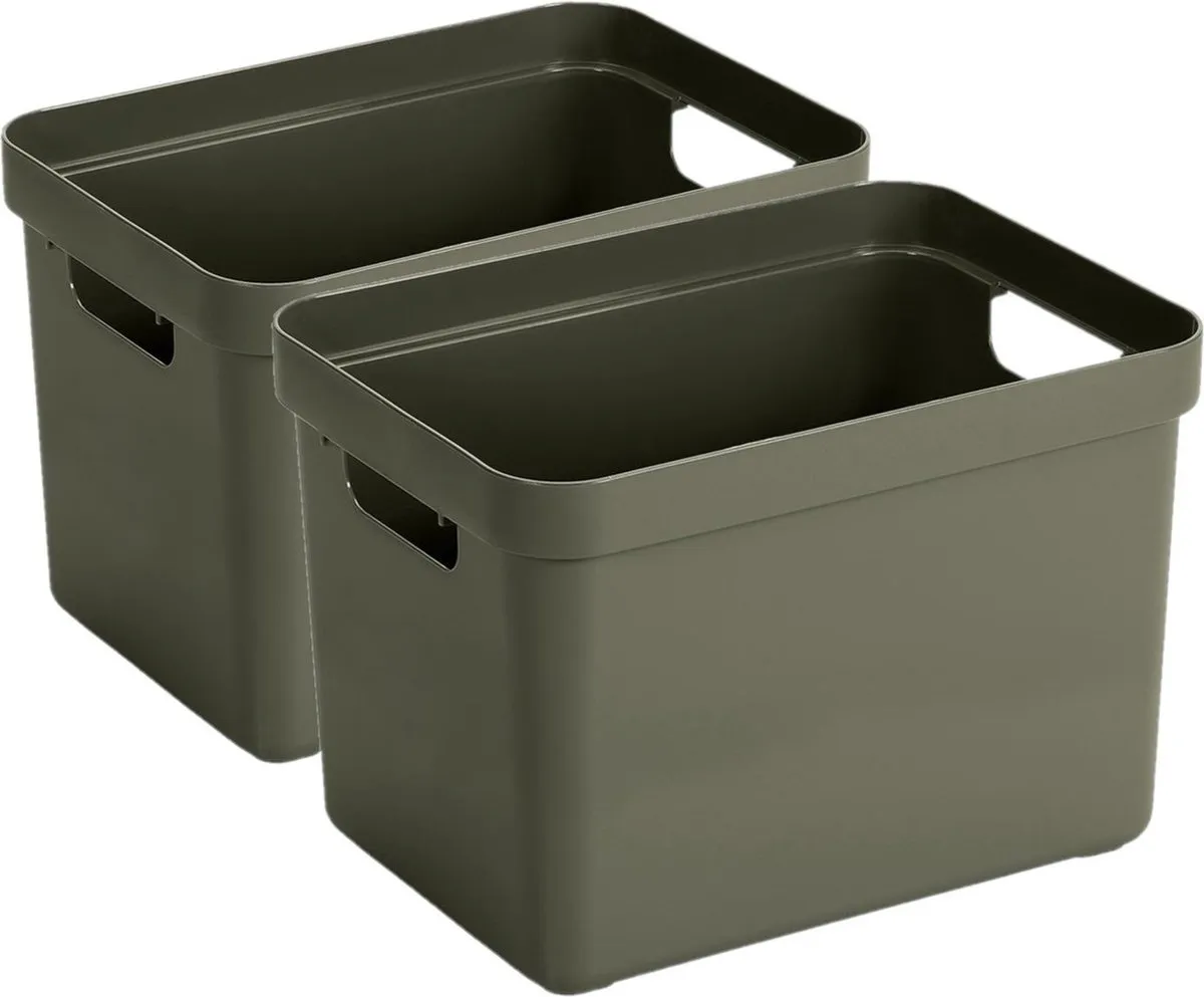 2x stuks donkergroene opbergboxen/opbergdozen/opbergmanden 18 liter kunststof. Door het moderne design en de luxe uitstraling van de boxen kun je deze opbergboxen/opbergdozen prima in de woonkamer of slaapkamer plaatsen. Deze box is bijvoorbeeld geschikt voor het opbergen van rondslingerend speelgoed, breiwerkjes of het opbergen van boeken. Ook ideaal voor in de badkamer of in de voorraadkast. De mand heeft handgrepen waardoor je ze gemakkelijk kunt dragen. Formaat: ongeveer 35 x 25 x 24.3 cm.