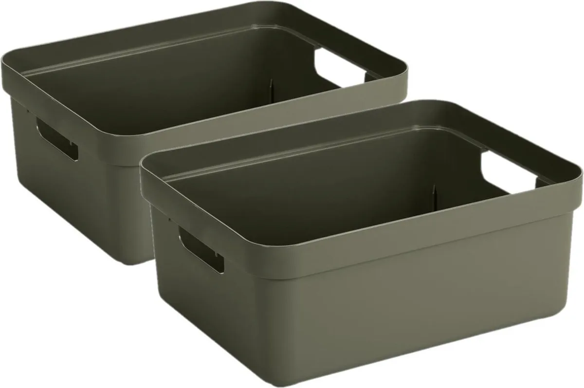 2x stuks donkergroene opbergboxen/opbergdozen/opbergmanden 24 liter kunststof. Door het moderne design en de luxe uitstraling van de boxen kun je deze opbergboxen/opbergdozen prima in de woonkamer of slaapkamer plaatsen. Deze box is bijvoorbeeld geschikt voor het opbergen van rondslingerend speelgoed, breiwerkjes of het opbergen van boeken. Ook ideaal voor in de badkamer of in de voorraadkast. De mand heeft handgrepen waardoor je ze gemakkelijk kunt dragen. Formaat: ongeveer 45,3 x 35,4 x 18,3 cm.