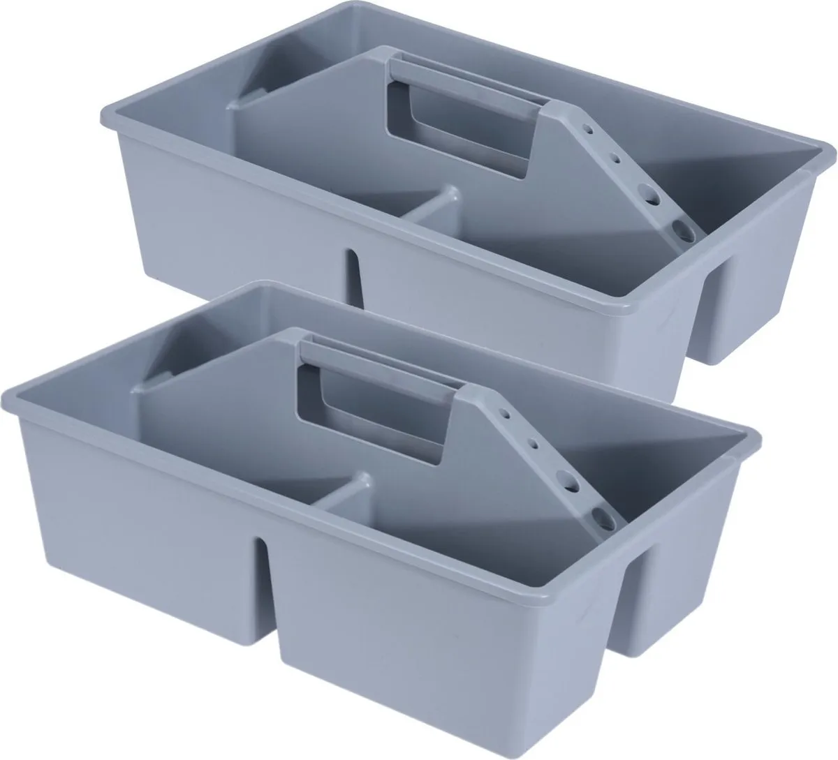 2x stuks gereedschap opbergbox/opbergdoos/mand grijs met handvat 39 x 26 x 12 cm kunststof. Een multifunctionele opberger voor het opbergen van o.a. schoonmaakspullen, gereedschap en spul in de voorraadkast. De opberger is voorzien van een zeer stevig handvat. Handige sorteerbox met vakjesindeling.