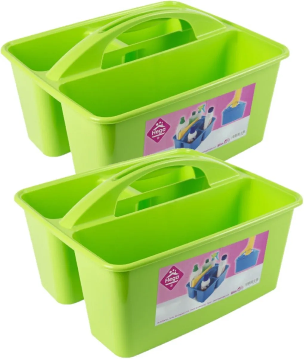 2x stuks groene opbergbox/opbergdoos mand met handvat 6 liter kunststof. Een multifunctionele opberger voor het opbergen van o.a. schoonmaakspullen en spul in de voorraadkast. De opberger is voorzien van een zeer stevig handvat.Afmeting: ca. 31 x 26,5 x 18 cm. Inhoud: ca. 6 liter. Materiaal: kunststof. Huishouding – Voorraad/opberg boxen/manden/bakken met handvat.
