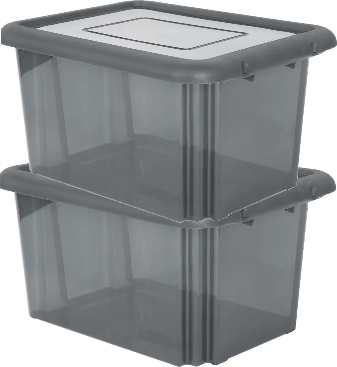 2x stuks opbergboxen/opbergdozen. Multifunctionele opberger voor het vocht- en stofvrij opbergen van een grote variatie spullen. Deze box is makkelijk te stapelen voor optimaal opberggemak. Ook is hij voorzien van handige en stevige sluitclips zodat het deksel goed op zijn plaats blijft. Inhoud: 55 liter. Afmetingen ca: 58 x 44 x 31 cm. Kleur: transparant grijs. Materiaal: kunststof.