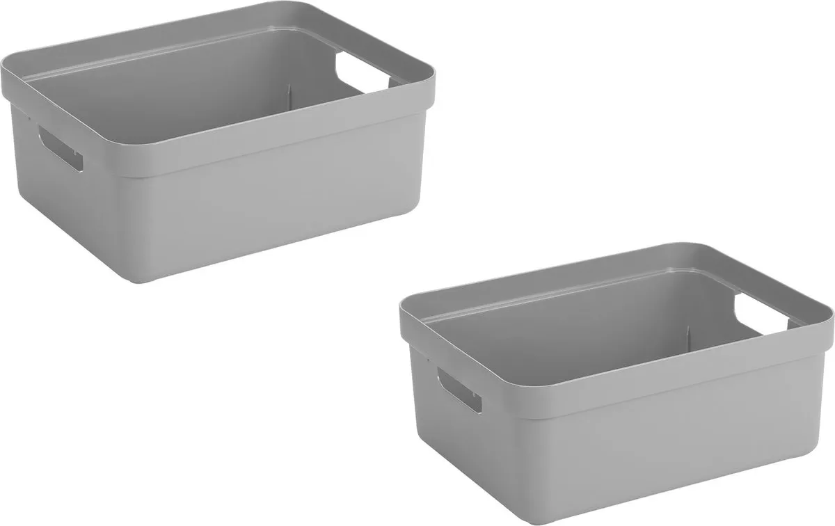 2x stuks lichtgrijze opbergboxen/opbergdozen/opbergmanden 24 liter kunststof. Door het moderne design en de luxe uitstraling van de boxen kun je deze opbergboxen/opbergdozen prima in de woonkamer of slaapkamer plaatsen. Deze box is bijvoorbeeld geschikt voor het opbergen van rondslingerend speelgoed, breiwerkjes of het opbergen van boeken. Ook ideaal voor in de badkamer of in de voorraadkast. De mand heeft handgrepen waardoor je ze gemakkelijk kunt dragen. Formaat: ongeveer 45,3 x 35,4 x 18,3 cm. Materiaal: kunststof. Aantal boxen: 2x. Deksel: geen. Inhoud: ca. 24 liter. Kleur: licht grijs. Opbergdozen/opbergboxen/manden voor het opbergen van spullen.