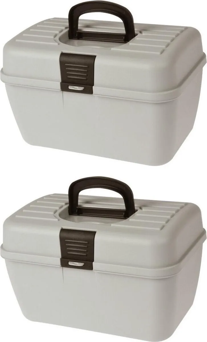 2x stuks opbergboxen/opbergkoffertjes 2-laags grijs. Deze tweelaagse opbergbox heeft een handig handvat en bestaat uit twee lagen. De bovenste laag bestaat uit 5 vakken en kan uit de box verwijderd worden. Onderin bestaat de opbergdoos uit 1 groot vak. Ideaal om bijvoorbeeld visspullen, sierraden of knutselmateriaal in te bewaren.