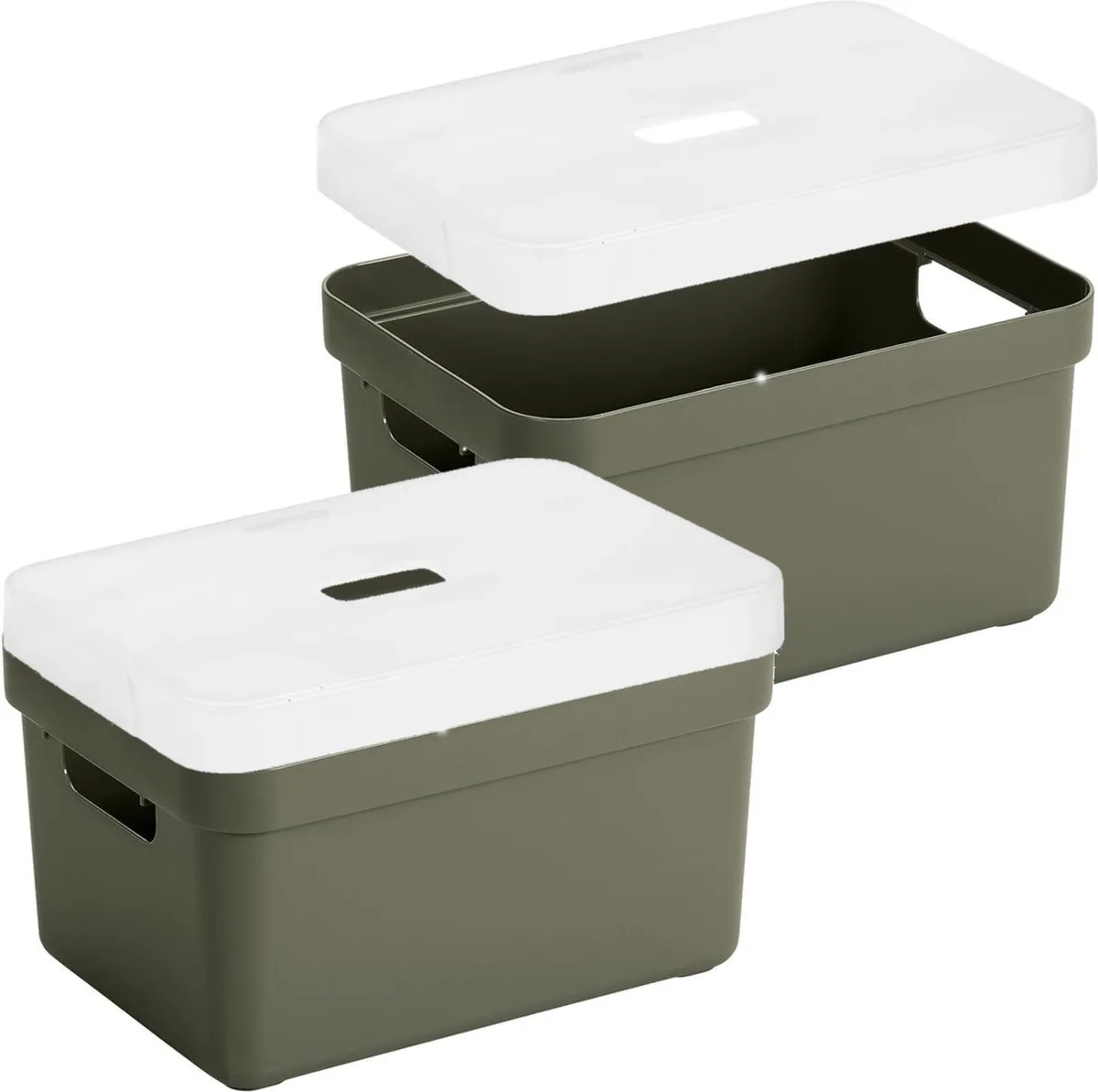 2x stuks opbergboxen/opbergmanden voor in huis in kleur donkergroen van 13 liter kunststof met transparante deksel. Door het moderne design en de luxe uitstraling van de boxen kun je deze opbergboxen/opbergdozen prima in de woonkamer of slaapkamer plaatsen. Deze mand/bak is bijvoorbeeld geschikt voor het opbergen van rondslingerend speelgoed, boeken, voedsel, troep. Ook ideaal voor in de badkamer of in de voorraadkast. De mand heeft handgrepen waardoor je ze gemakkelijk kunt dragen. Formaat: ongeveer 35 x 25 x 18 cm.