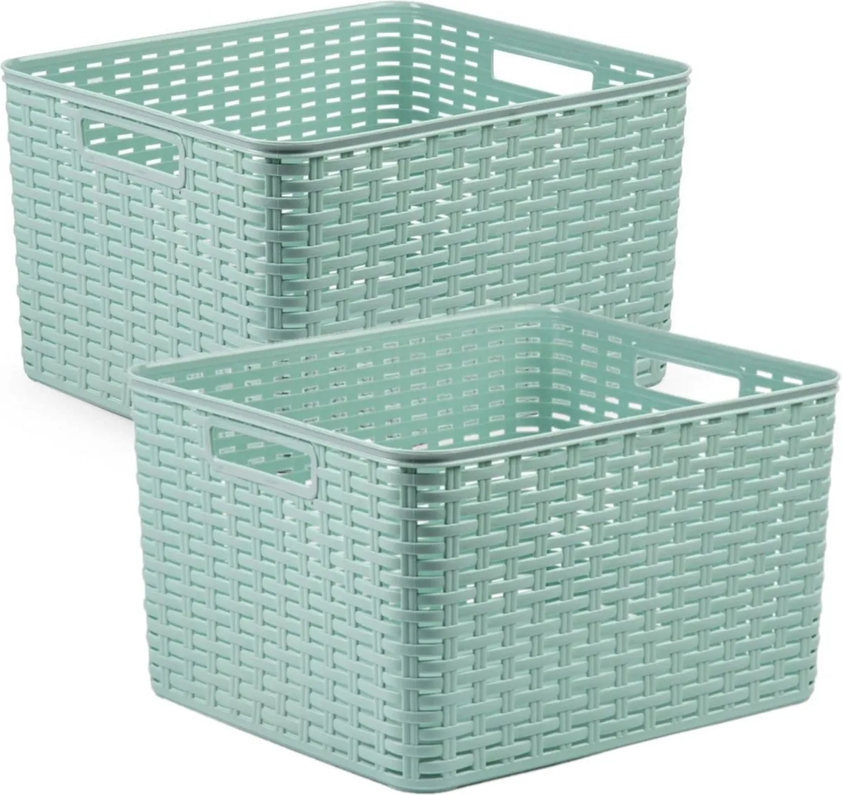 2x stuks rotan gevlochten opbergmand/opbergbox kunststof – mintgroen – 34 x 40 x 23 cm. Deze opbergboxen/dozen/manden zijn kast-organisers en zijn prima in de woonkamer, badkamer, keuken of slaapkamer te plaatsen. Deze box is bijvoorbeeld geschikt voor het opbergen van speelgoed, kleding stukken, kantoor spullen, etenswaren en het opbergen van diverse rommeltjes/spullen. Inhoud: 28 liter.
