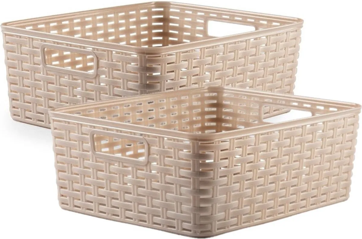 2x stuks rotan gevlochten opbergmand/opbergbox kunststof – Taupe – 28 x 36 x 13.5 cm – Kast mandjes