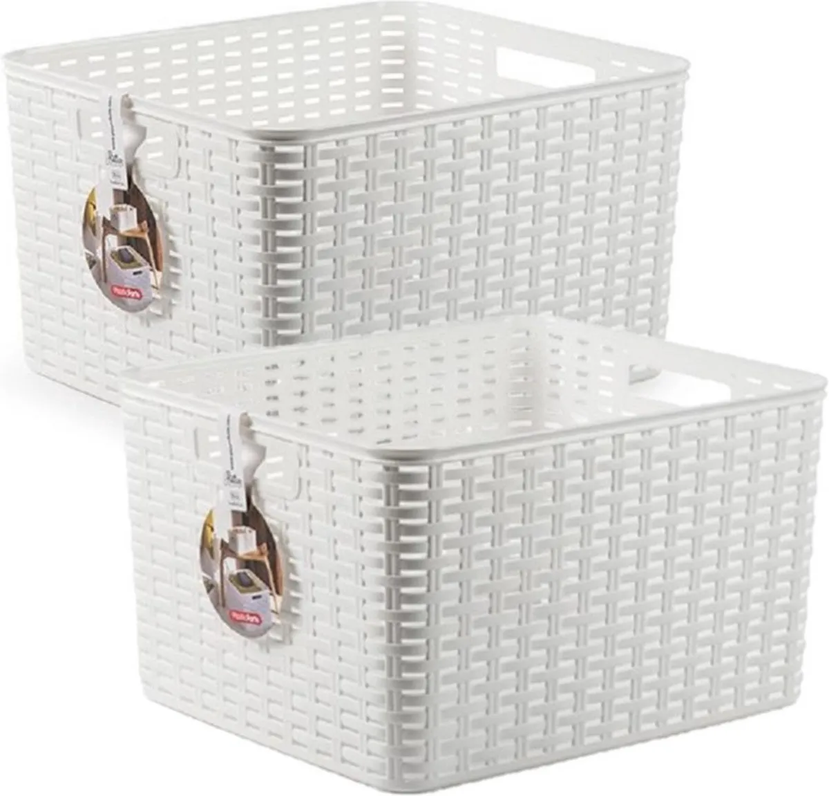 2x stuks rotan gevlochten opbergmand/opbergbox kunststof – wit – 34 x 40 x 23 cm. Deze opbergboxen/dozen/manden zijn kast-organisers en zijn prima in de woonkamer, badkamer, keuken of slaapkamer te plaatsen. Deze box is bijvoorbeeld geschikt voor het opbergen van speelgoed, kleding stukken, kantoor spullen, etenswaren en het opbergen van diverse rommeltjes/spullen. Inhoud: 28 liter.