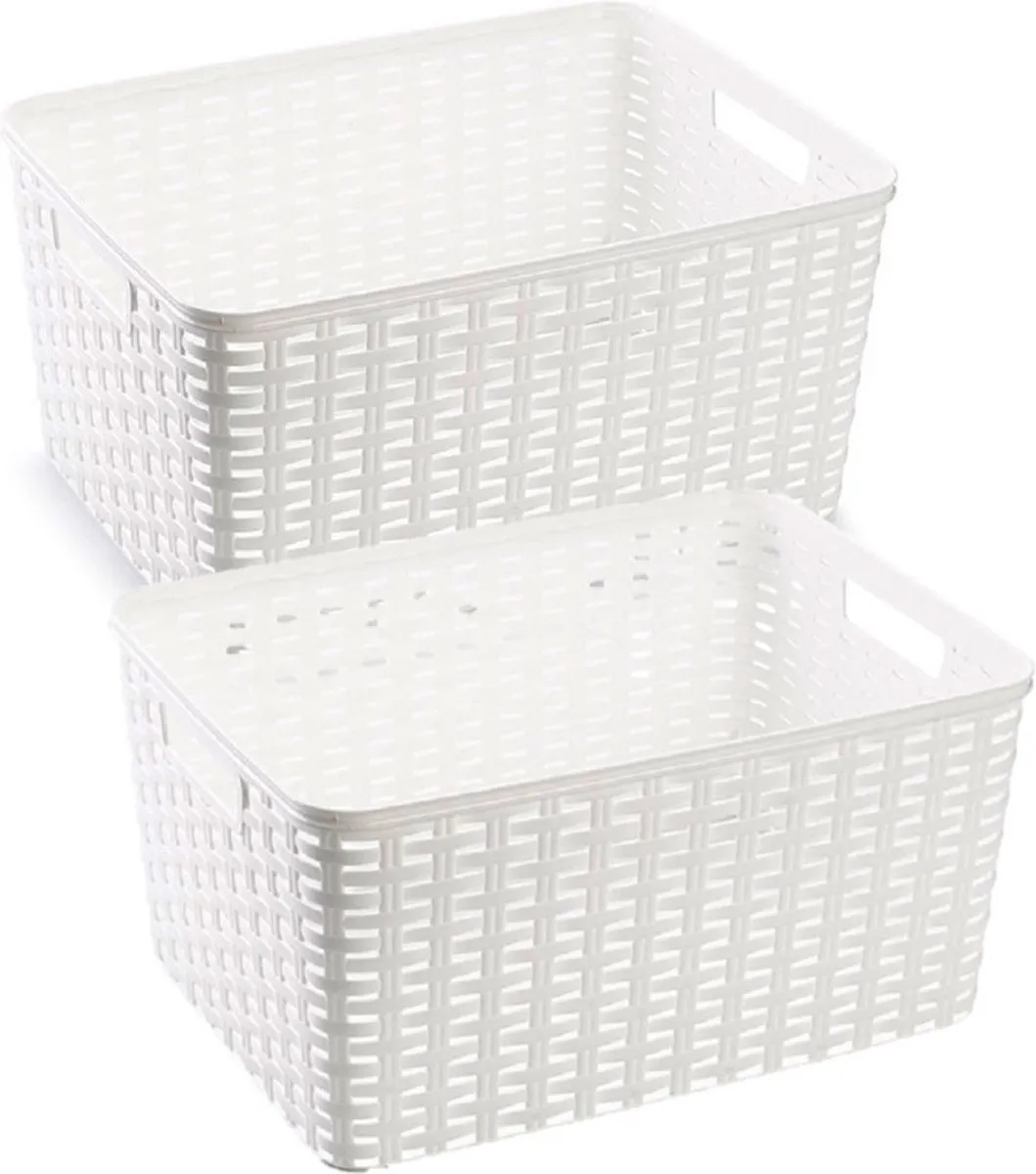 2x stuks rotan gevlochten opbergmand/opbergbox kunststof – Wit – 38 x 28 x 19 cm – Kast mandjes