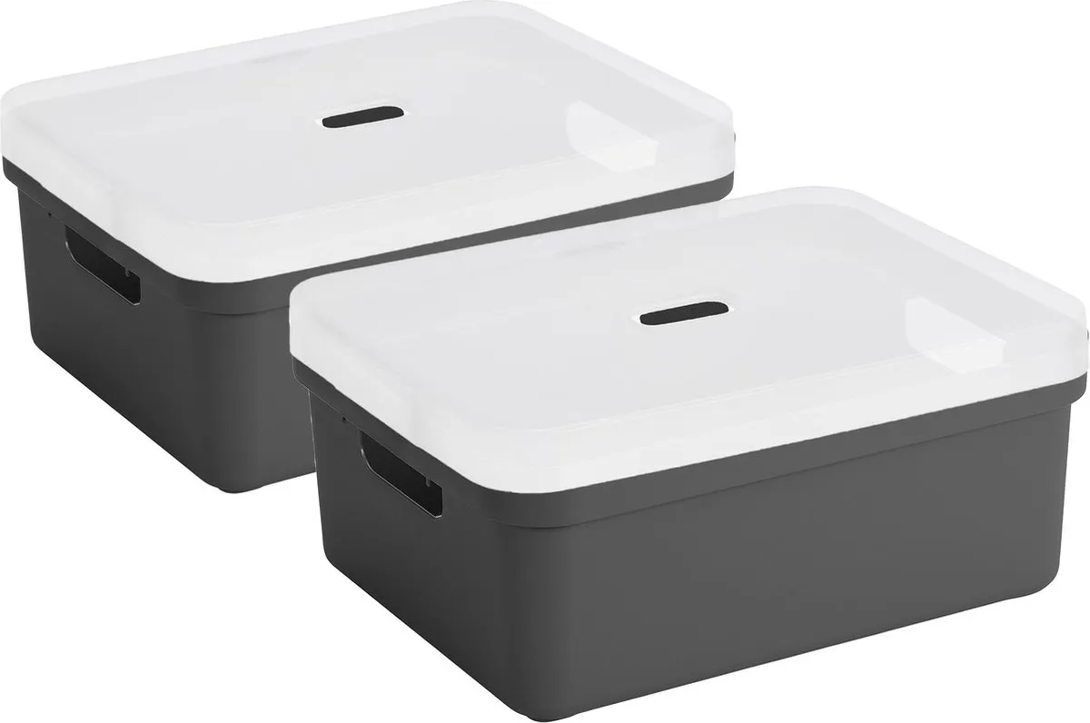 2x stuks Sunware opbergbox/opbergmand 24 liter antraciet grijs kunststof met transparante afsluit deksel. Door het moderne design en de luxe uitstraling van deze boxen kun je deze opbergboxen/opbergdozen prima in de woonkamer of slaapkamer plaatsen. Deze box is bijvoorbeeld geschikt voor het opbergen van rondslingerend speelgoed, het opbergen van boeken, en al je schuur of kledingkast spullen. Ook ideaal voor in de badkamer of in de voorraadkast. De mand heeft handgrepen waardoor je ze gemakkelijk kunt dragen. Formaat boxen: ongeveer 45,3 x 35,4 x 18,3 cm. Stapelbaar.