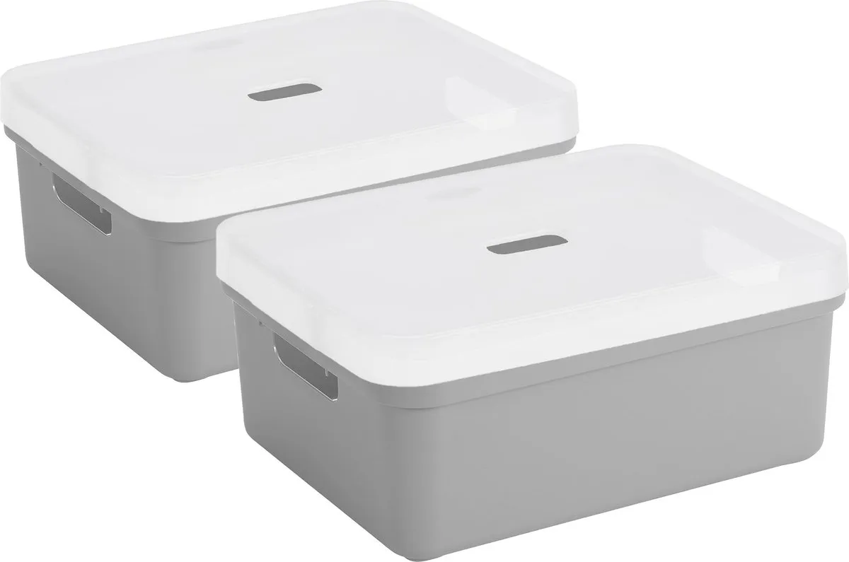2x stuks Sunware opbergbox/opbergmand 24 liter lichtgrijs kunststof met transparante afsluit deksel. Door het moderne design en de luxe uitstraling van deze boxen kun je deze opbergboxen/opbergdozen prima in de woonkamer of slaapkamer plaatsen. Deze box is bijvoorbeeld geschikt voor het opbergen van rondslingerend speelgoed, het opbergen van boeken, en al je schuur of kledingkast spullen. Ook ideaal voor in de badkamer of in de voorraadkast. De mand heeft handgrepen waardoor je ze gemakkelijk kunt dragen. Formaat boxen: ongeveer 45,3 x 35,4 x 18,3 cm. Stapelbaar.