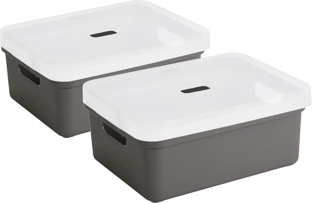 2x stuks Sunware opbergbox/opbergmand 24 liter taupe bruin kunststof met transparante afsluit deksel. Door het moderne design en de luxe uitstraling van deze boxen kun je deze opbergboxen/opbergdozen prima in de woonkamer of slaapkamer plaatsen. Deze box is bijvoorbeeld geschikt voor het opbergen van rondslingerend speelgoed, het opbergen van boeken, en al je schuur of kledingkast spullen. Ook ideaal voor in de badkamer of in de voorraadkast. De mand heeft handgrepen waardoor je ze gemakkelijk kunt dragen. Formaat boxen: ongeveer 45,3 x 35,4 x 18,3 cm. Stapelbaar.