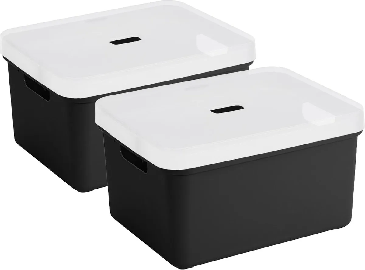 2x stuks Sunware opbergbox/opbergmand 32 liter zwart kunststof met transparante afsluit deksel. Door het moderne design en de luxe uitstraling van deze boxen kun je deze opbergboxen/opbergdozen prima in de woonkamer of slaapkamer plaatsen. Deze box is bijvoorbeeld geschikt voor het opbergen van rondslingerend speelgoed, het opbergen van boeken, en al je schuur of kledingkast spullen. Ook ideaal voor in de badkamer of in de voorraadkast. De mand heeft handgrepen waardoor je ze gemakkelijk kunt dragen. Formaat boxen: ongeveer 45,3 x 35,4 x 24,3 cm. Stapelbaar.