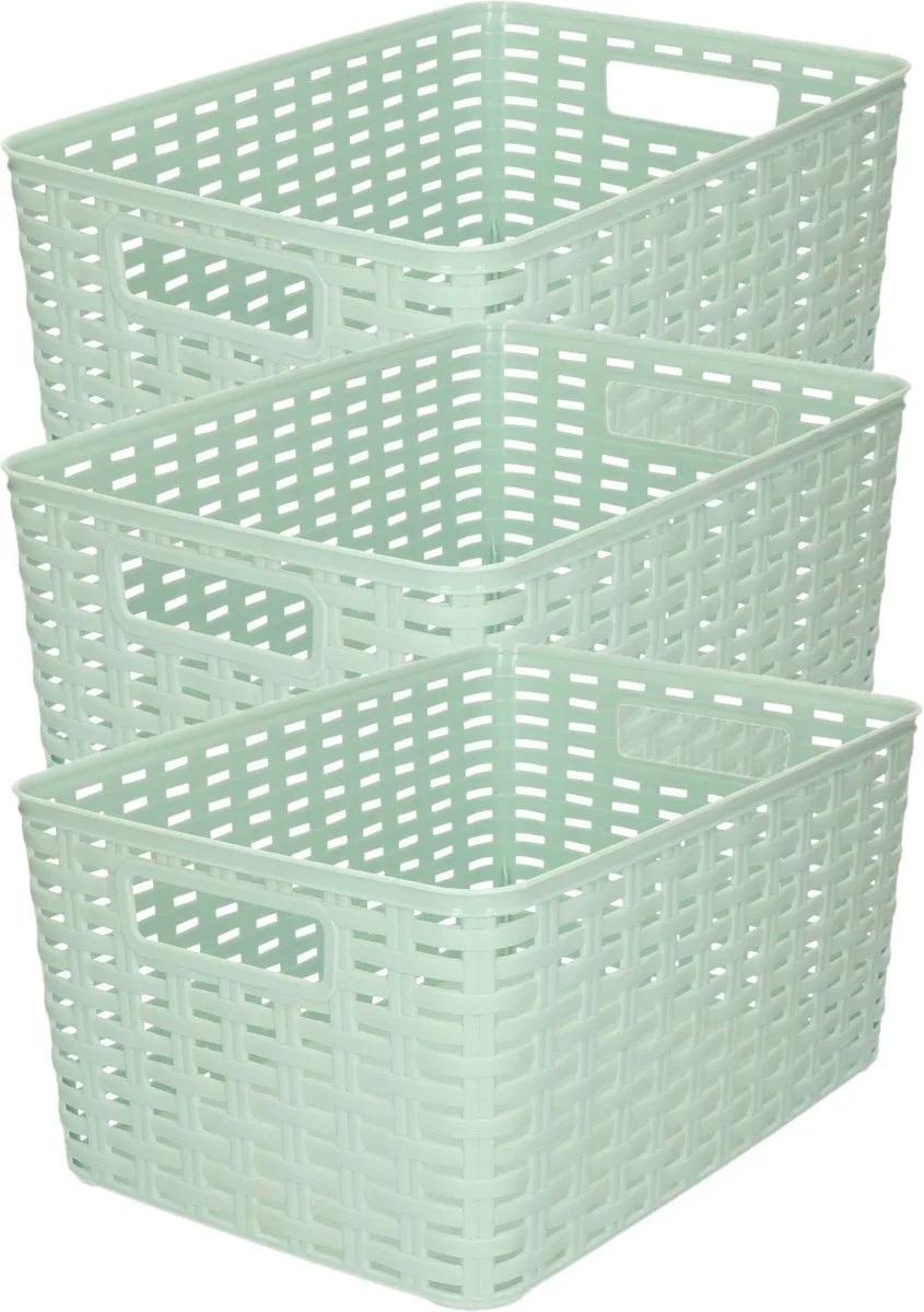 3x stuks rotan gevlochten opbergmand/opbergbox kunststof – Mintgroen – 22 x 33 x 16 cm. Deze opbergboxen/dozen/manden zijn kast-organisers en zijn prima in de woonkamer, badkamer, keuken of slaapkamer te plaatsen. Deze box is bijvoorbeeld geschikt voor het opbergen van speelgoed, kleding stukken, kantoor spullen, etenswaren en het opbergen van diverse rommeltjes/spullen. Inhoud: 10 liter.
