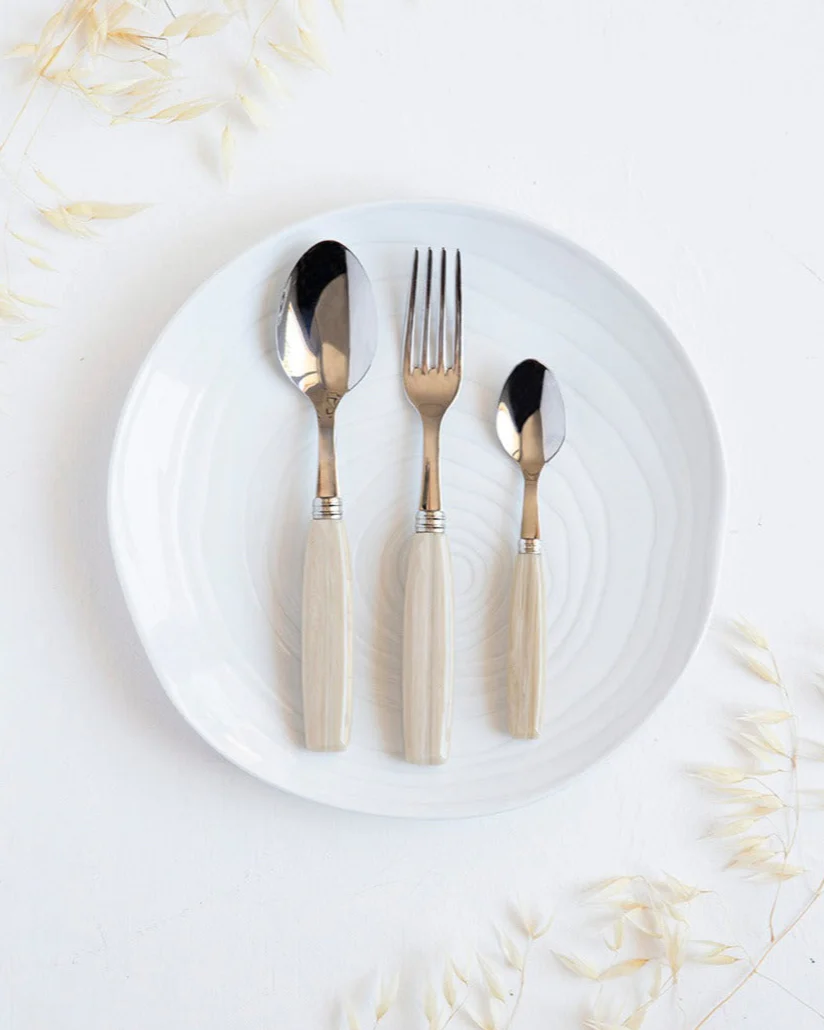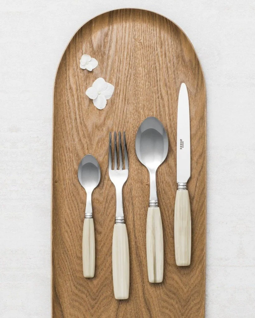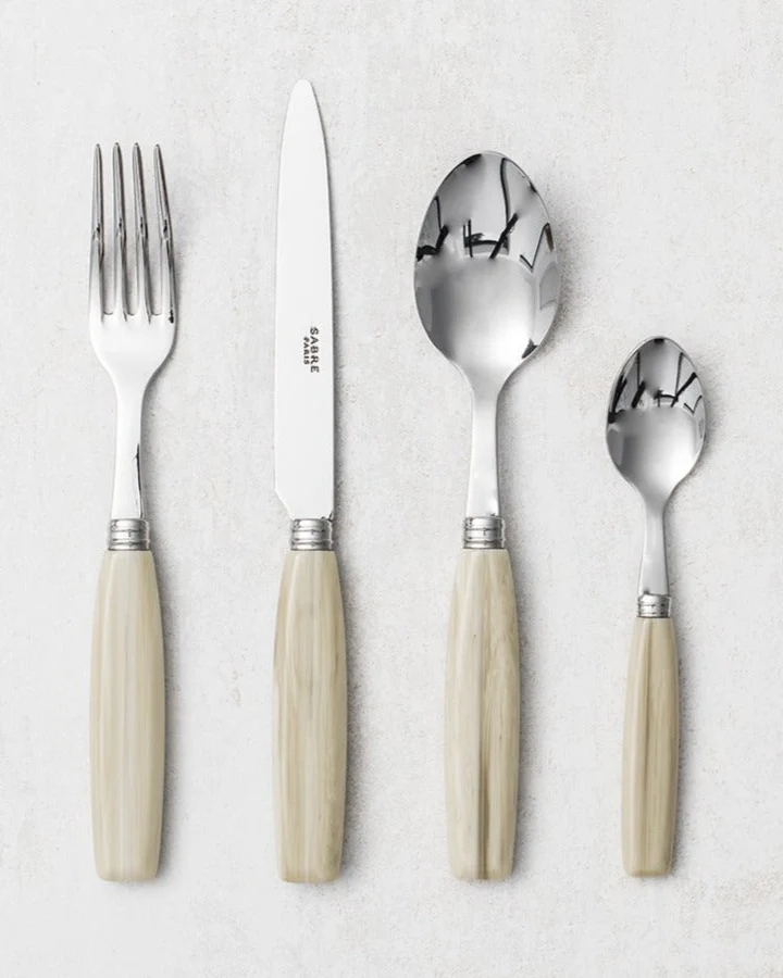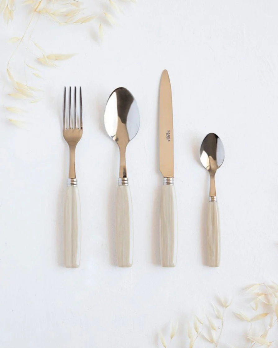 Modern Frans bestek dat uitnodigt om van huis te reizen met een origineel en exotisch design. Het ivoorkleurige Djembe bestek is een klassiek-moderne luxe voor onze momenten aan tafel.