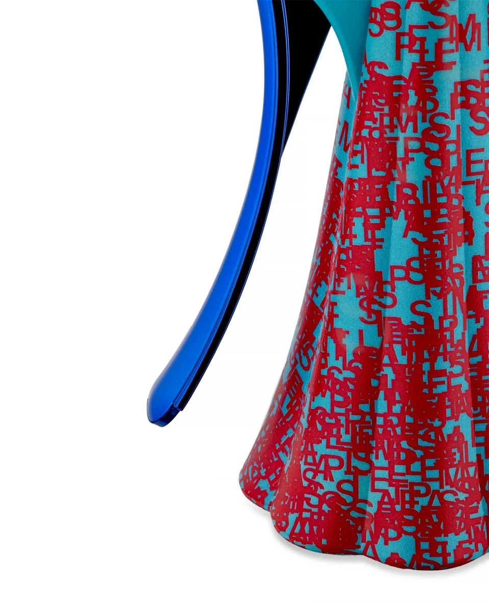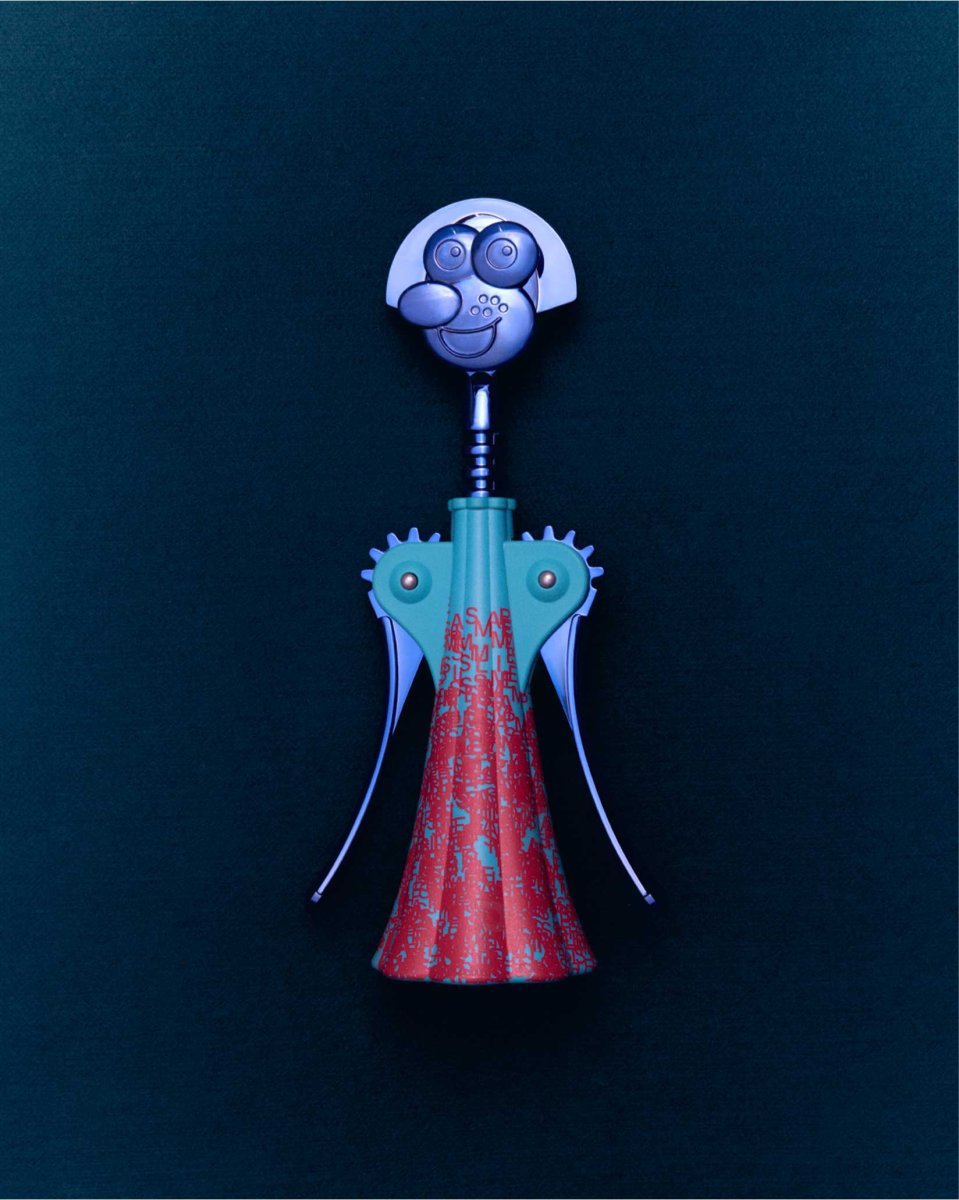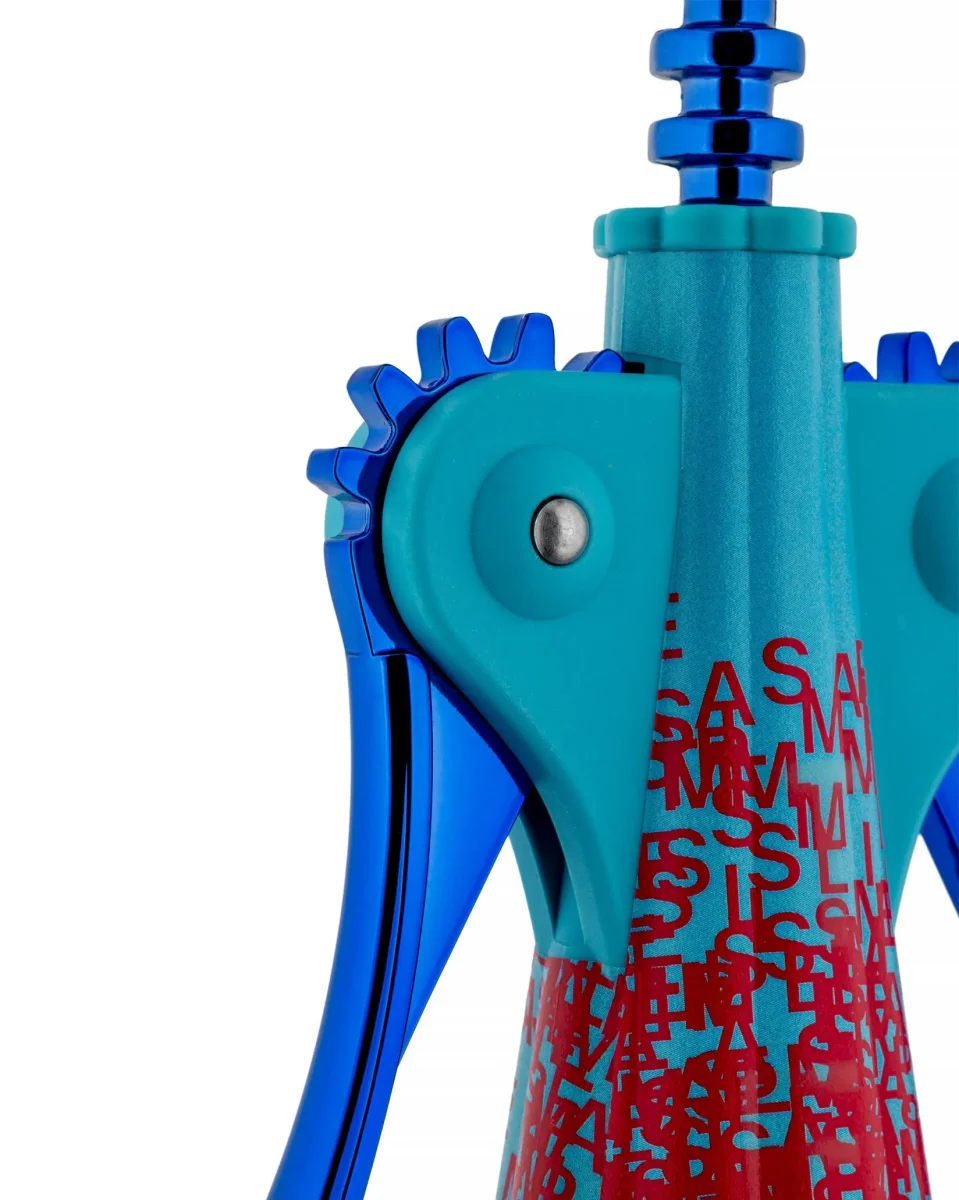 Studio Temp draws from the deep well of street art to offer a contemporary and cryptic interpretation of the iconic corkscrew designed by Alessandro Mendini, produced in a limited edition of only nine pieces plus one artist’s proof. The decoration includes phosphorescent elements that become visible only in the dark and is enhanced by a blue PVD finish on the metallic surfaces, as well as a special mask: a caricature of Pepina, Studio Temp’s mascot dog.