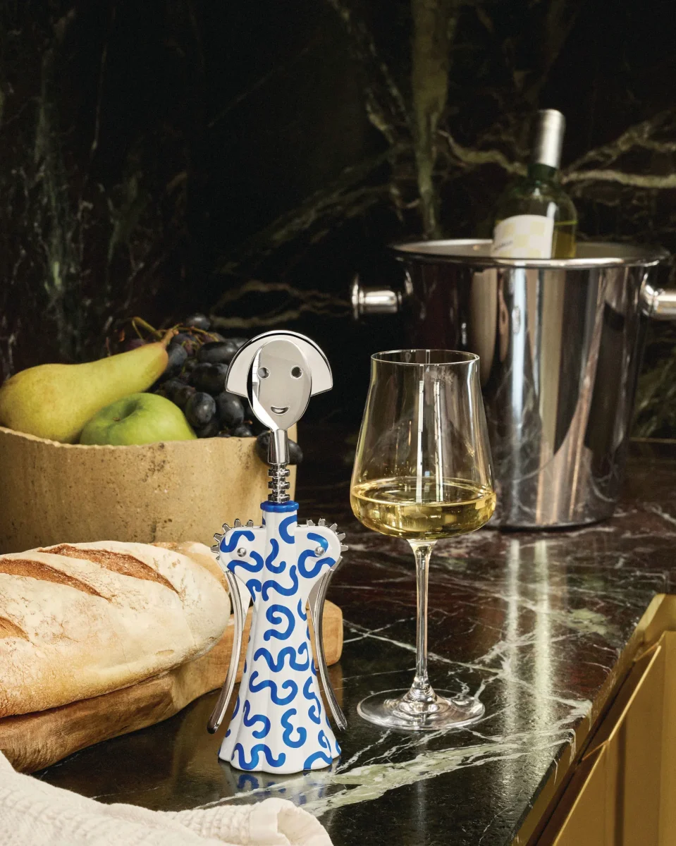 The Delft decoration brings a gust of foreign elegance to the famous corkscrew, reinterpreting the art of Dutch ceramics. Mendini draws from the colours of the ancient tradition of Delftware in a totally personal manner: the charm of the decoration, noted the designer, “lies in generating evocative forms, drawing from the world of fables, childhood tales and the iconography of the agrarian memories of Dutch grandmothers”.