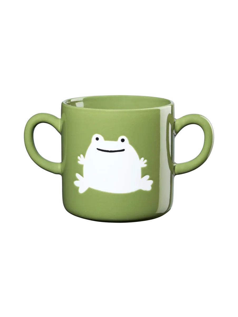 De ASA Home Kids mok met kikker is ontworpen om kinderen op een speelse en veilige manier te laten genieten van hun favoriete drankjes. Op zowel de voor- als achterkant staat een vriendelijk kikkertje afgebeeld in frisse groentinten op een witte achtergrond. De twee handige oren maken de beker extra stabiel en makkelijk vast te houden – ideaal voor kleine kinderhanden.