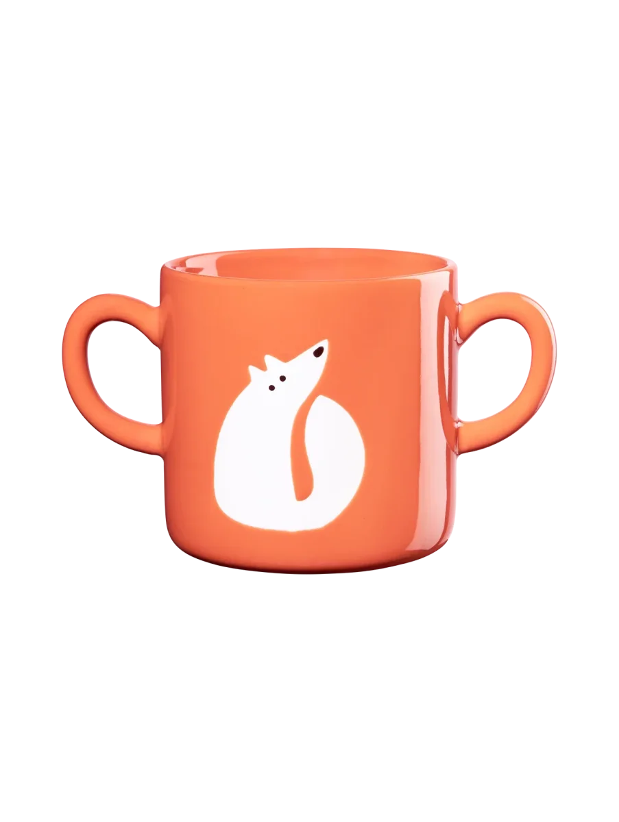 Schattige kinderbeker met een vriendelijk vosmotief in warme oranje tinten.