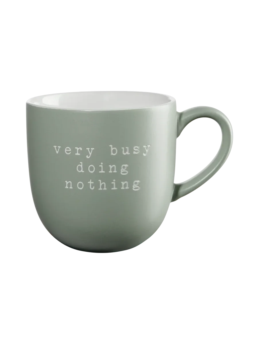 De mok is bedrukt met de tekst “Very Busy Doing Nothing”, ideaal voor relaxte dagen waarop je niets hoeft en alleen wilt genieten van een heerlijke koffie, thee of warme chocolademelk.