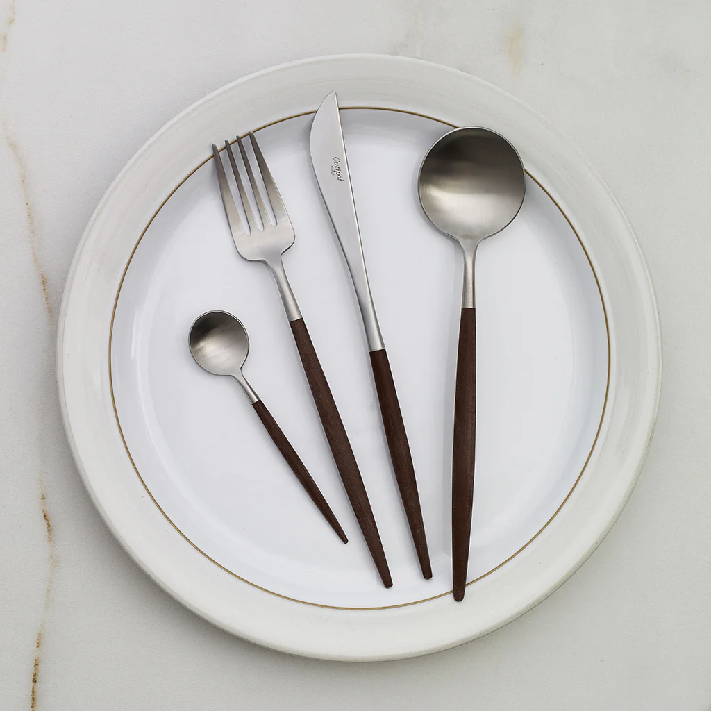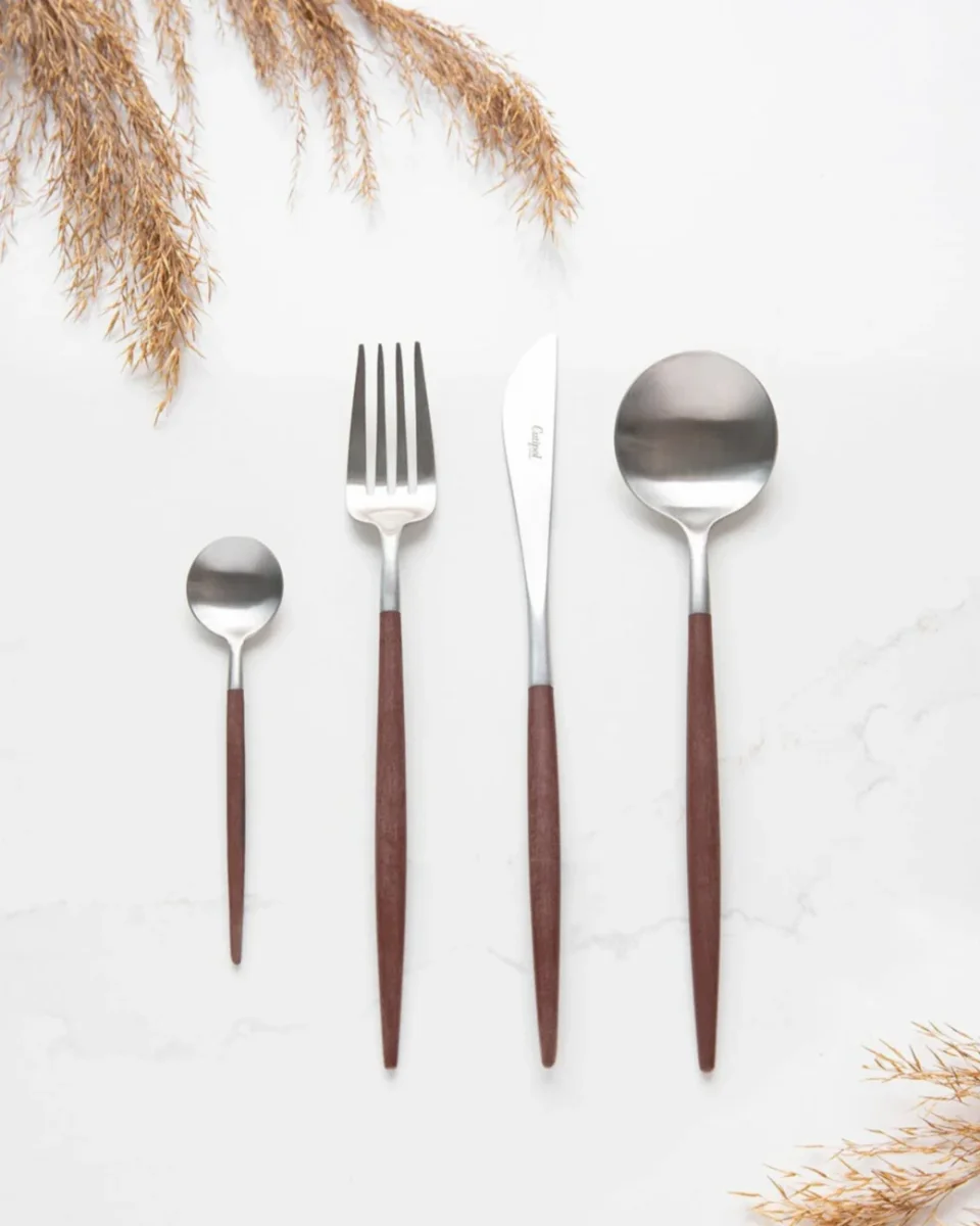 Set van 4 stuks hoogwaardig roestvrijstalen bestek (18/10) met een matte afwerking, gecombineerd met een handvat van bruin hars.