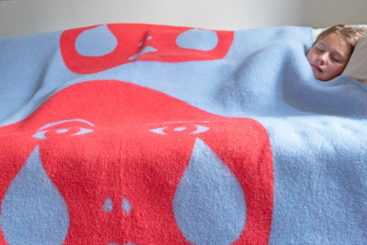 Grote en warme wollen deken gemaakt in mooie felle kleuren. De deken is gemaakt van de zachtste lamswol uit Noorwegen en geverfd met milieuvriendelijke kleuren. Het heeft decoratieve stiksels rond de randen.