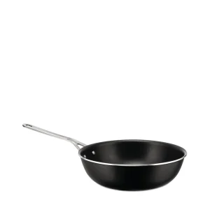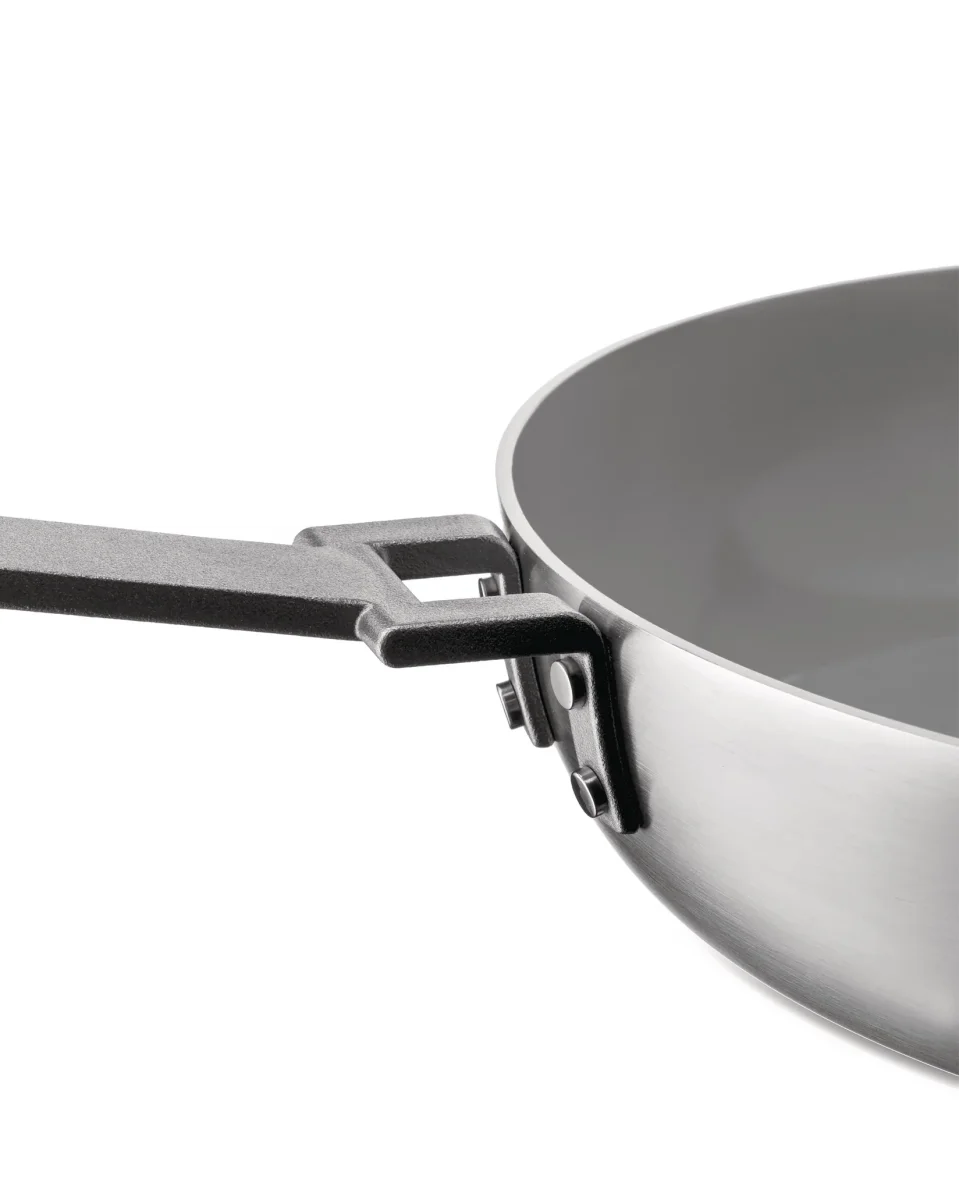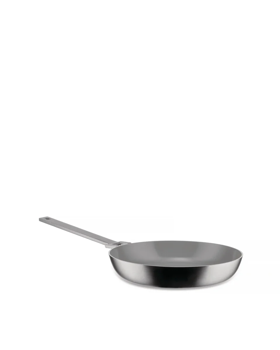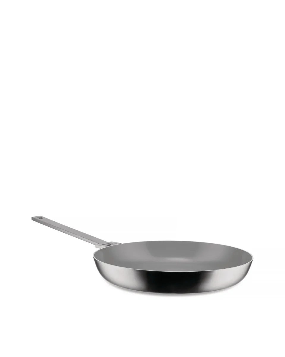 Frying pan in multiply (AISI 430, aluminium, 18/10 stainless steel), mat. Handle in 18/10 stainless steel with PVD coating. Ceramic non-stick interior. Magnetic steel bottom also suitable for induction cooking.
