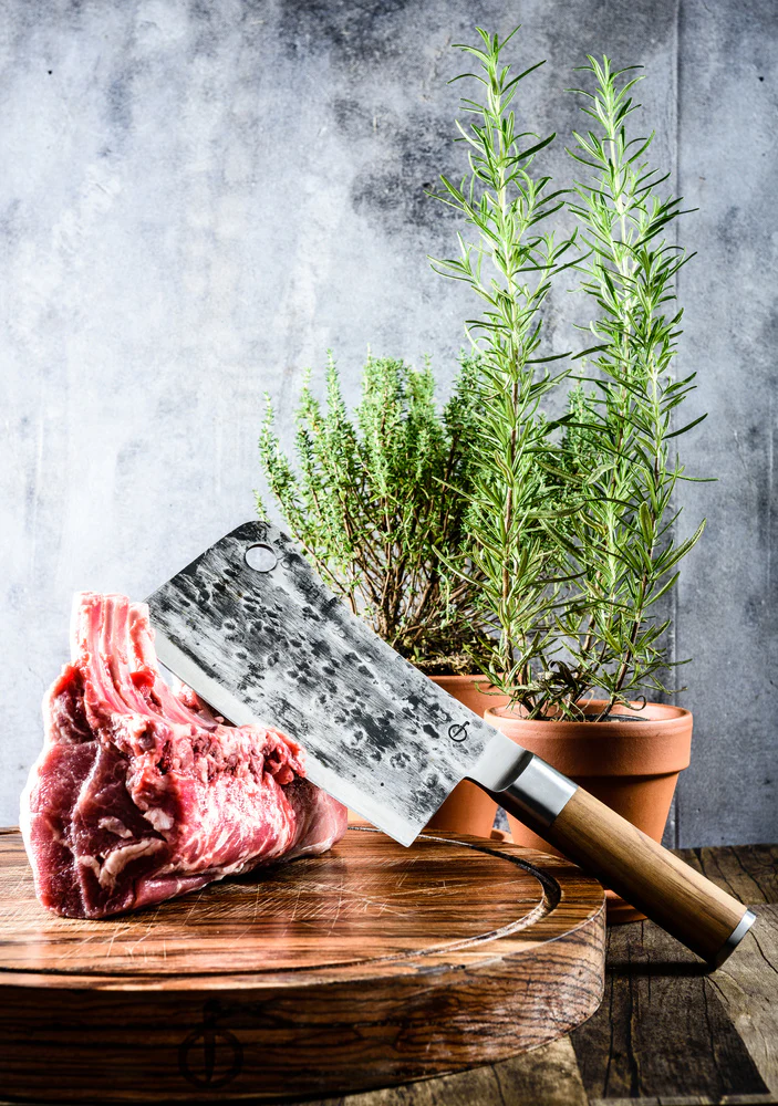 De Forged Olive Cleaver is handgeslagen en vervaardigd uit staal (58 HRC Rockwell) en olijfhout. Het heeft een zeer robuuste uitstraling door de afwerking van het lemmet van het hakbijl. Het lemmet heeft een dikke van 4 mm dik en kan niet in de vaatwasser