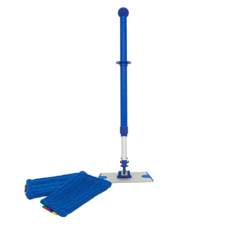 Het Interieurmop systeem met 2 moppen is bedoeld voor het makkelijker en ergonomisch schoonmaken van: (vergader)tafels, deuren, kasten, gladde waterbestendige wanden en balies. De mop wordt met klittenband (velcro) bevestigd op de telescopisch verstelbare steel met daaraan bevestigd het mopplaatje. Het systeem is er als verlenging van je arm. Voor het schoonmaken van hoge deuren, kasten en bijvoorbeeld tegelwanden heb je zo geen trapje meer nodig. Het systeem is ook uiterst geschikt voor het schoonmaken van vergadertafels.