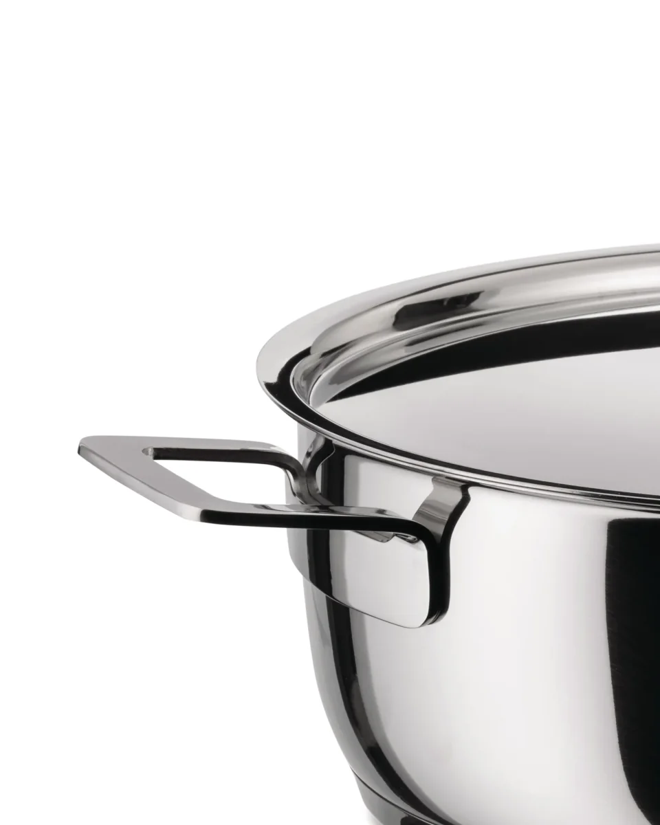 Low casserole with two handles in 18/10 stainless steel. Magnetic steel bottom suitable for induction cooking.