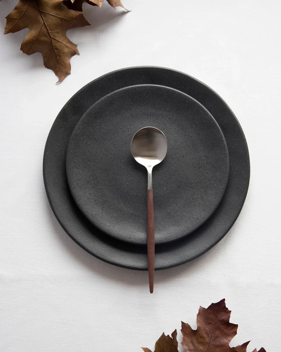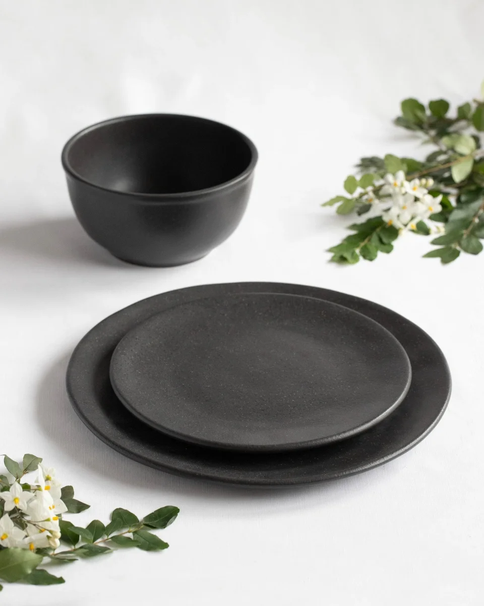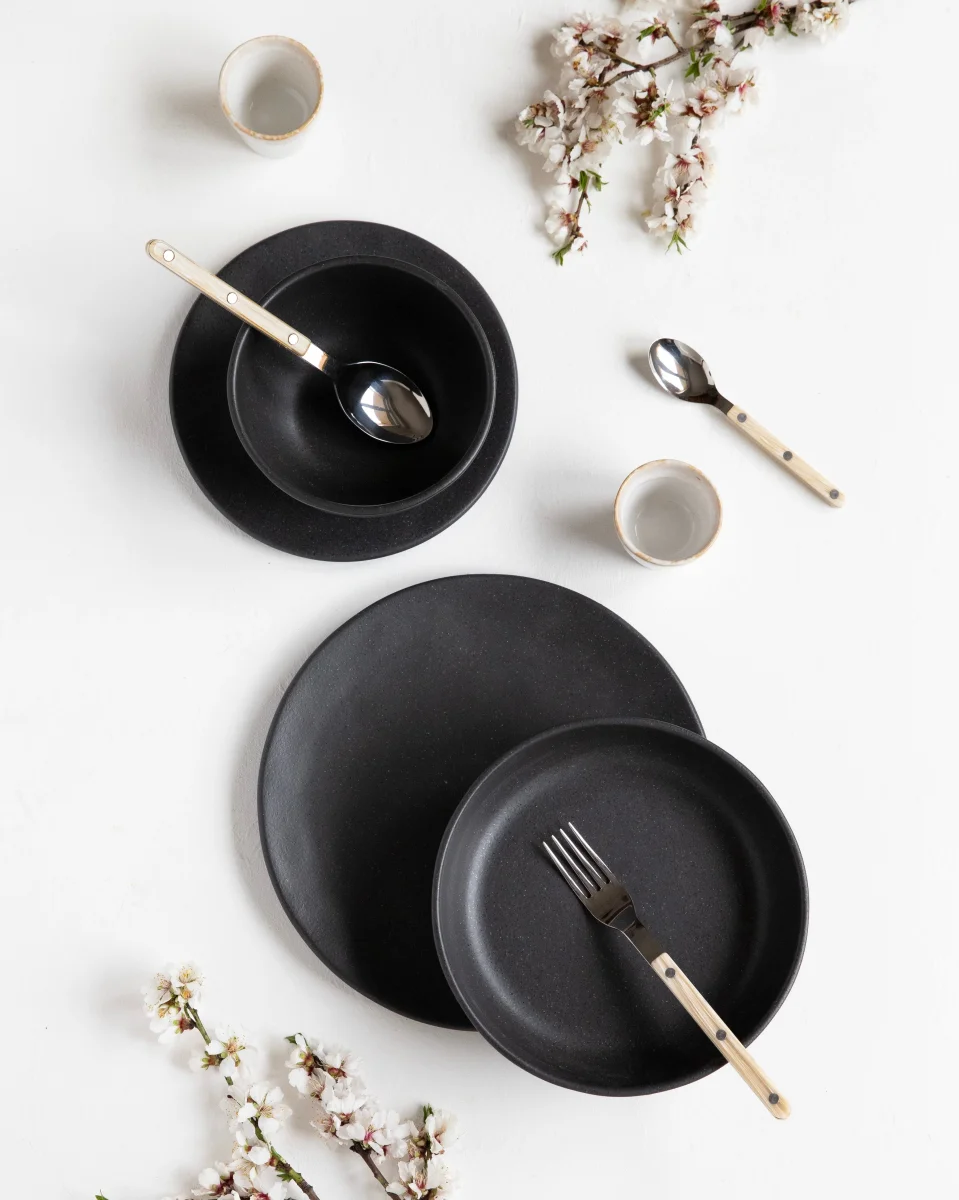 De complete set met Roda Ardosia servies. Elegante en tijdloze matzwarte producten. Gemaakt van fijn steengoed door Costa Nova in Portugal.