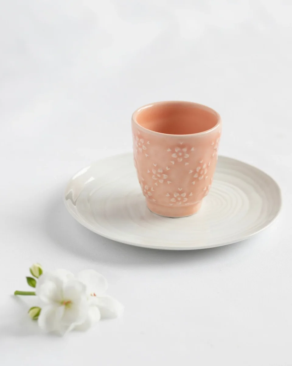 De koraalkleurige afwerking en reliëfstructuur maken dit kopje tot een uniek stuk met veel persoonlijkheid, ideaal om uw servies aan te vullen of een stijlvolle koffieset samen te stellen.