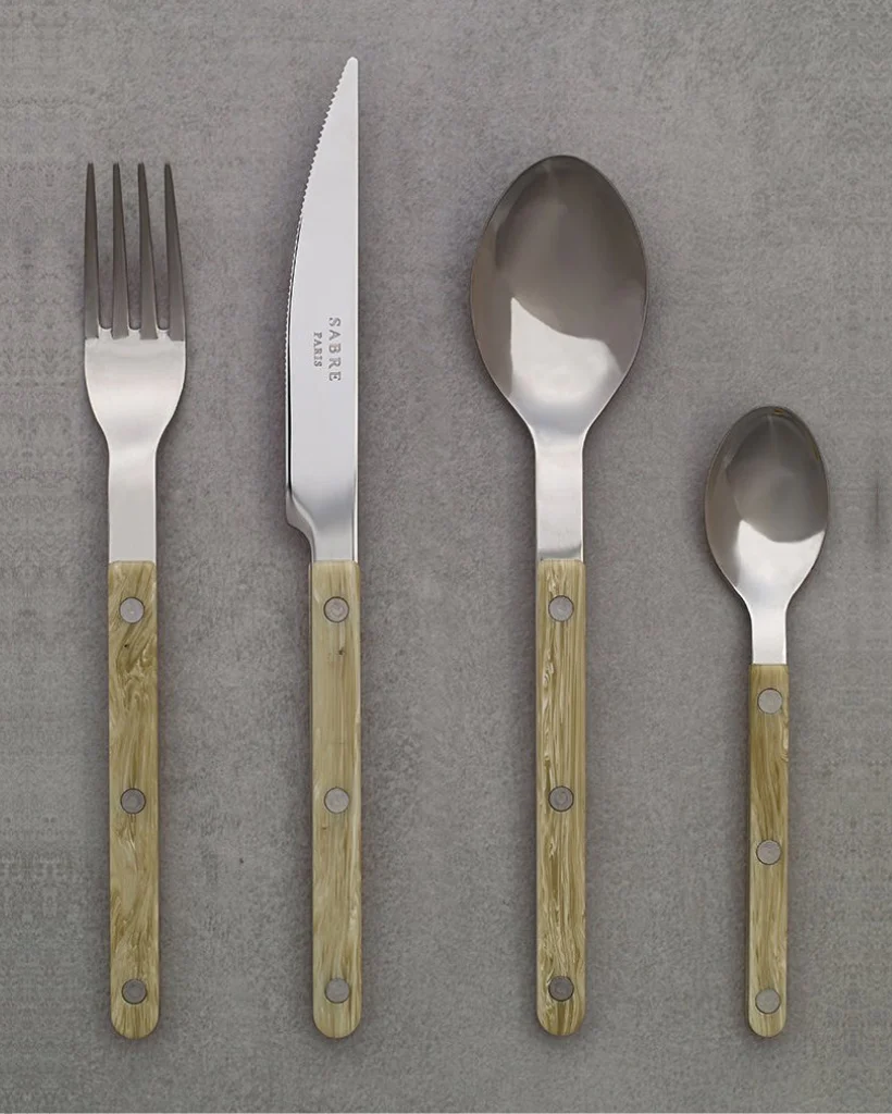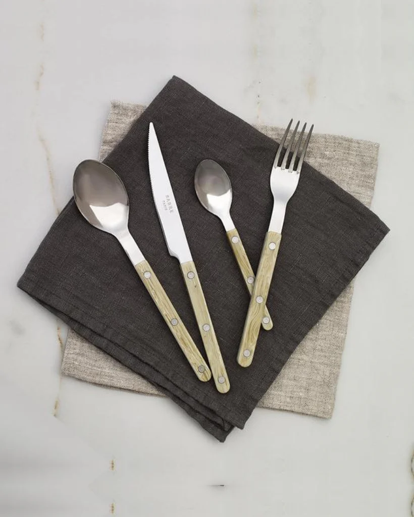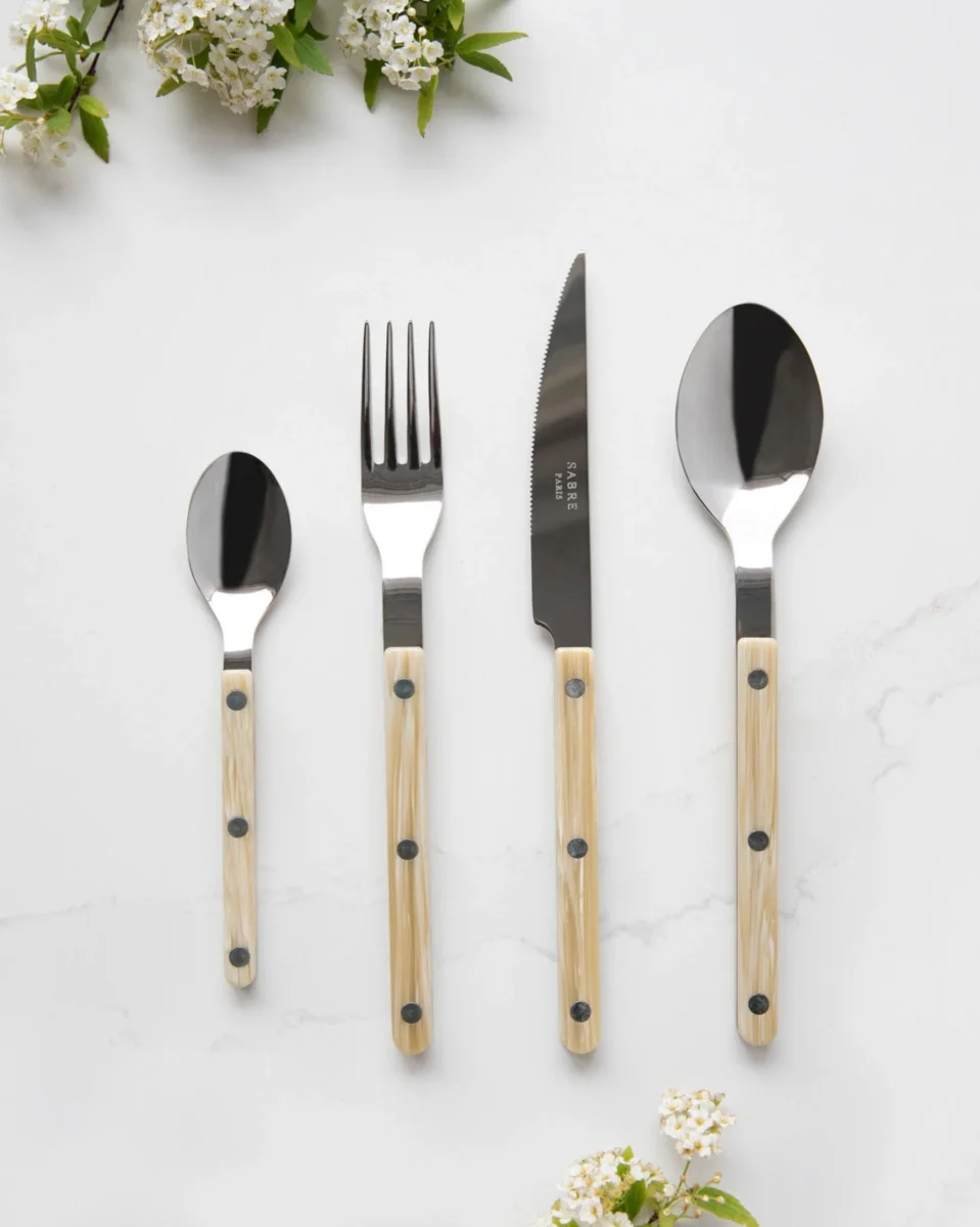 De traditionele Bistrot-versie is vernieuwd en gemoderniseerd in deze nieuwe onregelmatige ivoorkleur op het handvat. Klassiek en modern komen samen in deze perfecte combinatie om een Frans tintje aan uw tafelaankleding te geven. “Smakelijk”