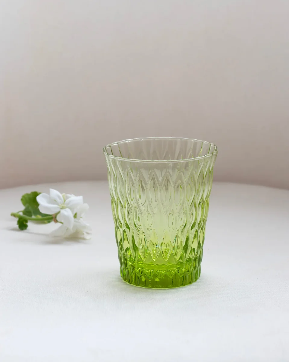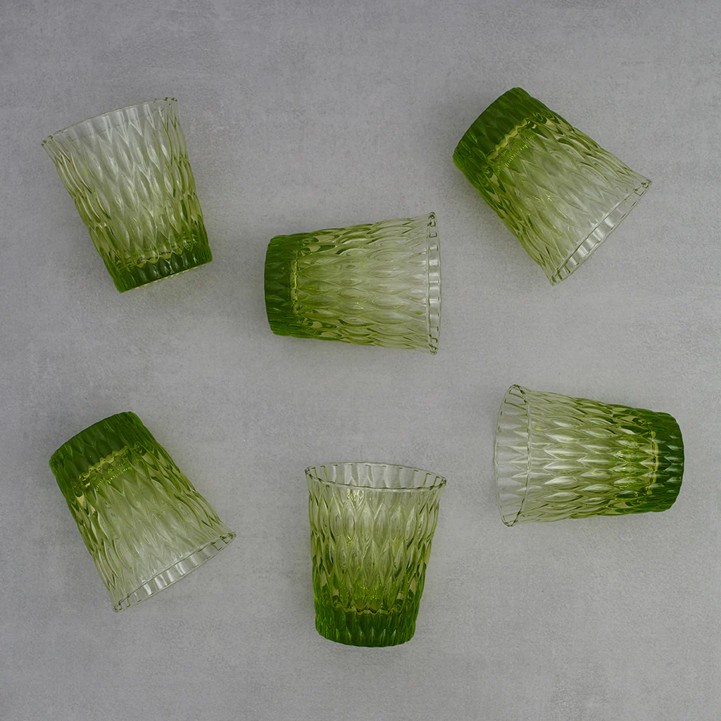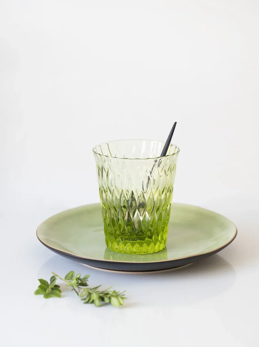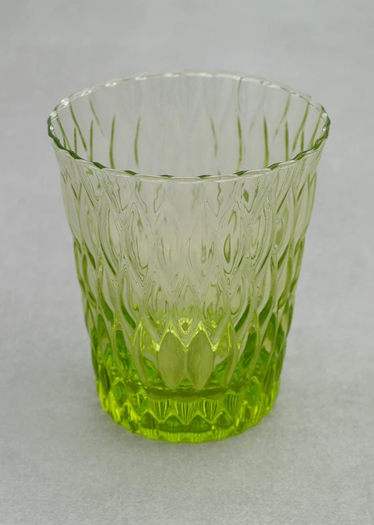 De zuurgroene kleur wordt geleverd door het materiaal, namelijk gekleurd glas. De productie gebeurt met de hand en er is geen kleurstof aanwezig, zodat de kleur ondanks wassen altijd blijft behouden.