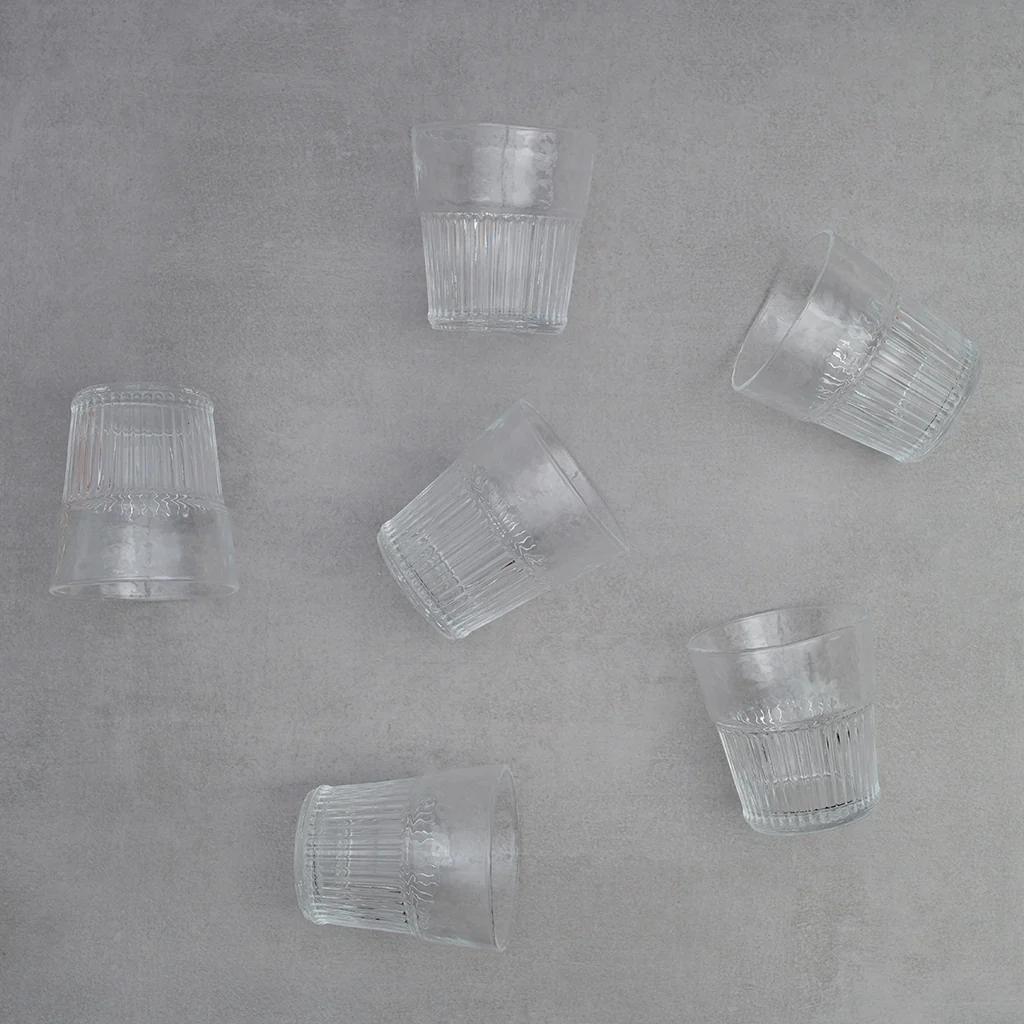 Collectie handgemaakte industriële design brillen. Deze glazen combineren moderne en industriële stijlen, waardoor je informele of meer bijzondere tafels kunt creëren, afhankelijk van de collectie serviesgoed en accessoires die je gebruikt. De imperfecte glaskleur is het meest opvallende kenmerk.