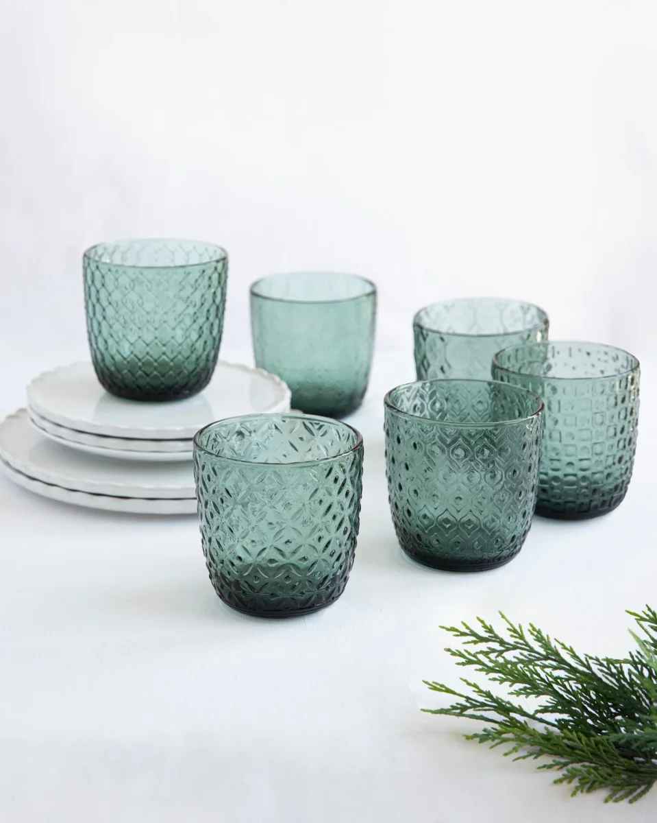 Collectie designbrillen met reliëftexturen, in dit geval in olijfgroen. Geïnspireerd door de revolutie van geometrische vormen uit de jaren zestig is het een unieke en bijzondere collectie die een statement zal maken op je tafel. Het is een collectie van handgeblazen glas door Italiaanse glasmeesters, waarbij elk detail minutieus is verzorgd.
