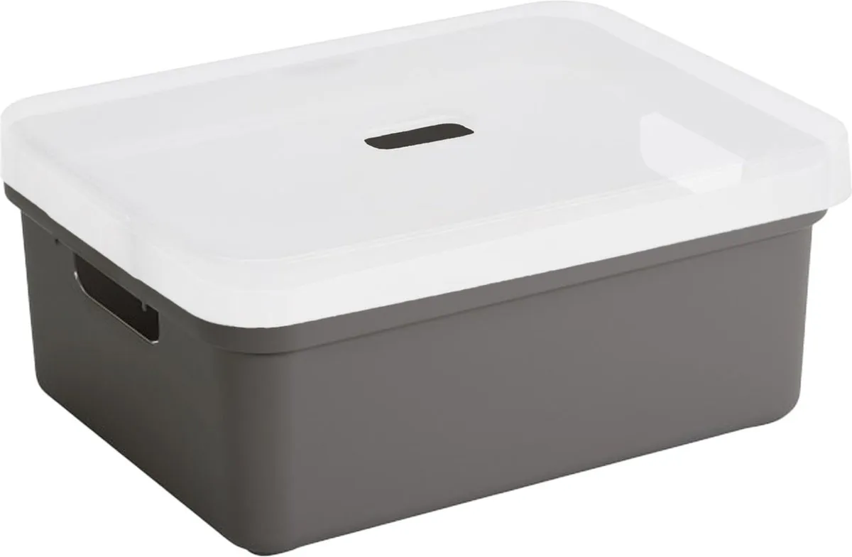 Sunware opbergbox/opbergmand 24 liter taupe bruin kunststof met transparante afsluit deksel. Door het moderne design en de luxe uitstraling van deze boxen kun je deze opbergboxen/opbergdozen prima in de woonkamer of slaapkamer plaatsen. Deze box is bijvoorbeeld geschikt voor het opbergen van rondslingerend speelgoed, het opbergen van boeken, en al je schuur of kledingkast spullen. Ook ideaal voor in de badkamer of in de voorraadkast. De mand heeft handgrepen waardoor je ze gemakkelijk kunt dragen. Formaat boxen: ongeveer 45,3 x 35,4 x 18,3 cm. Stapelbaar.