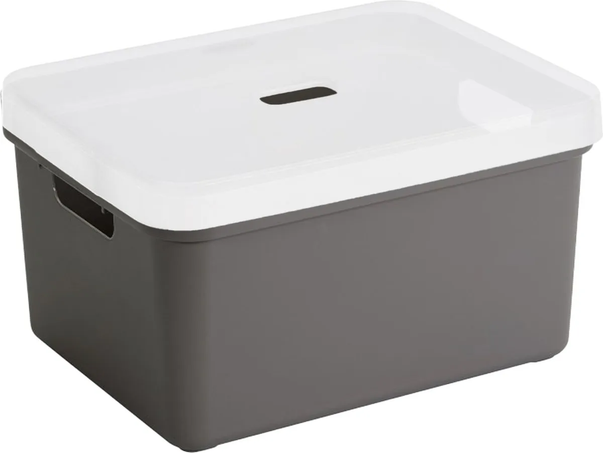 Sunware opbergbox/opbergmand 32 liter taupe kunststof met transparante afsluit deksel. Door het moderne design en de luxe uitstraling van deze boxen kun je deze opbergboxen/opbergdozen prima in de woonkamer of slaapkamer plaatsen. Deze box is bijvoorbeeld geschikt voor het opbergen van rondslingerend speelgoed, het opbergen van boeken, en al je schuur of kledingkast spullen. Ook ideaal voor in de badkamer of in de voorraadkast. De mand heeft handgrepen waardoor je ze gemakkelijk kunt dragen. Formaat boxen: ongeveer 45,3 x 35,4 x 24,3 cm. Stapelbaar.