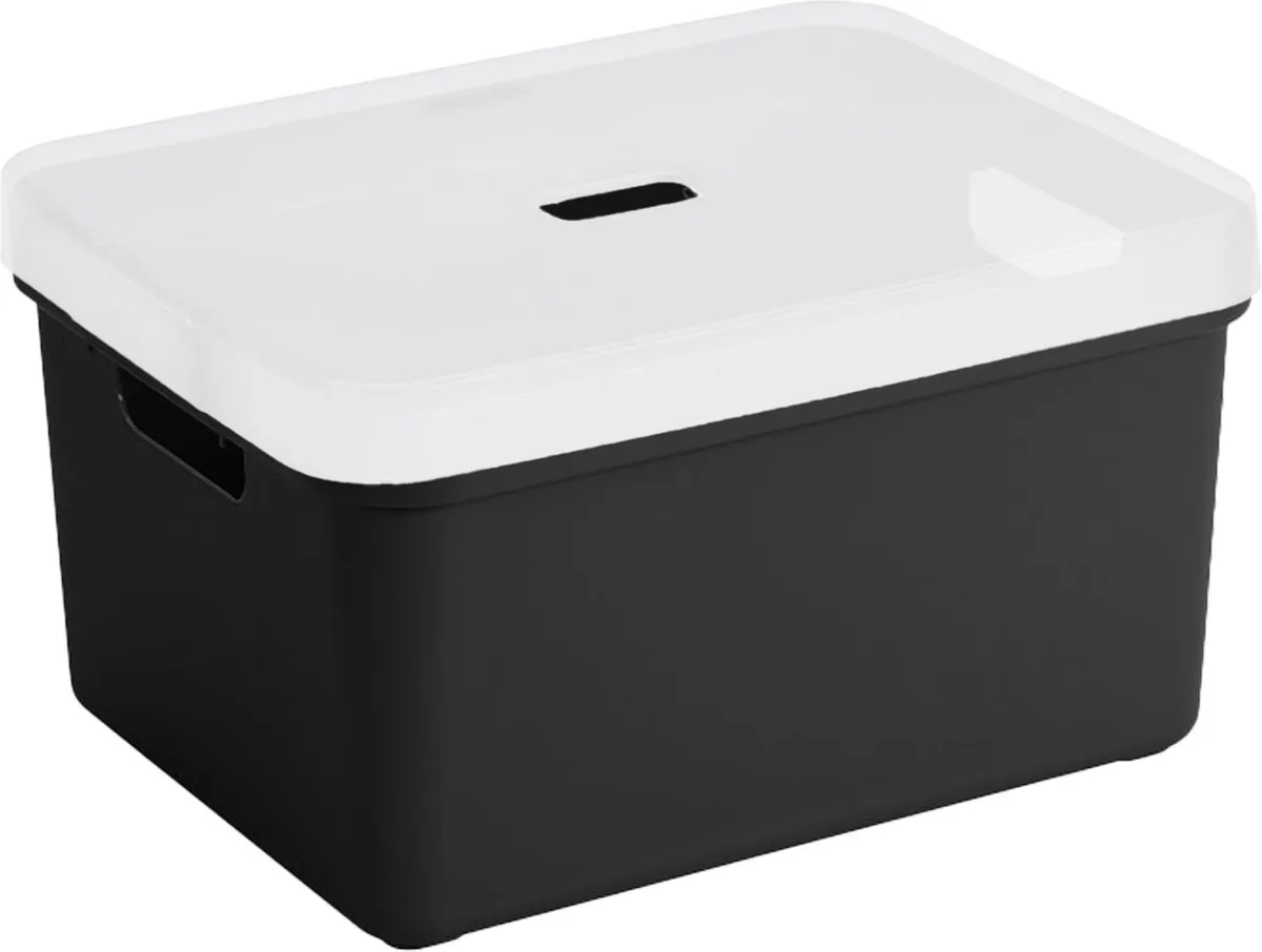 Sunware opbergbox/opbergmand 32 liter zwart kunststof met transparante afsluit deksel. Door het moderne design en de luxe uitstraling van deze boxen kun je deze opbergboxen/opbergdozen prima in de woonkamer of slaapkamer plaatsen. Deze box is bijvoorbeeld geschikt voor het opbergen van rondslingerend speelgoed, het opbergen van boeken, en al je schuur of kledingkast spullen. Ook ideaal voor in de badkamer of in de voorraadkast. De mand heeft handgrepen waardoor je ze gemakkelijk kunt dragen. Formaat boxen: ongeveer 45,3 x 35,4 x 24,3 cm. Stapelbaar.