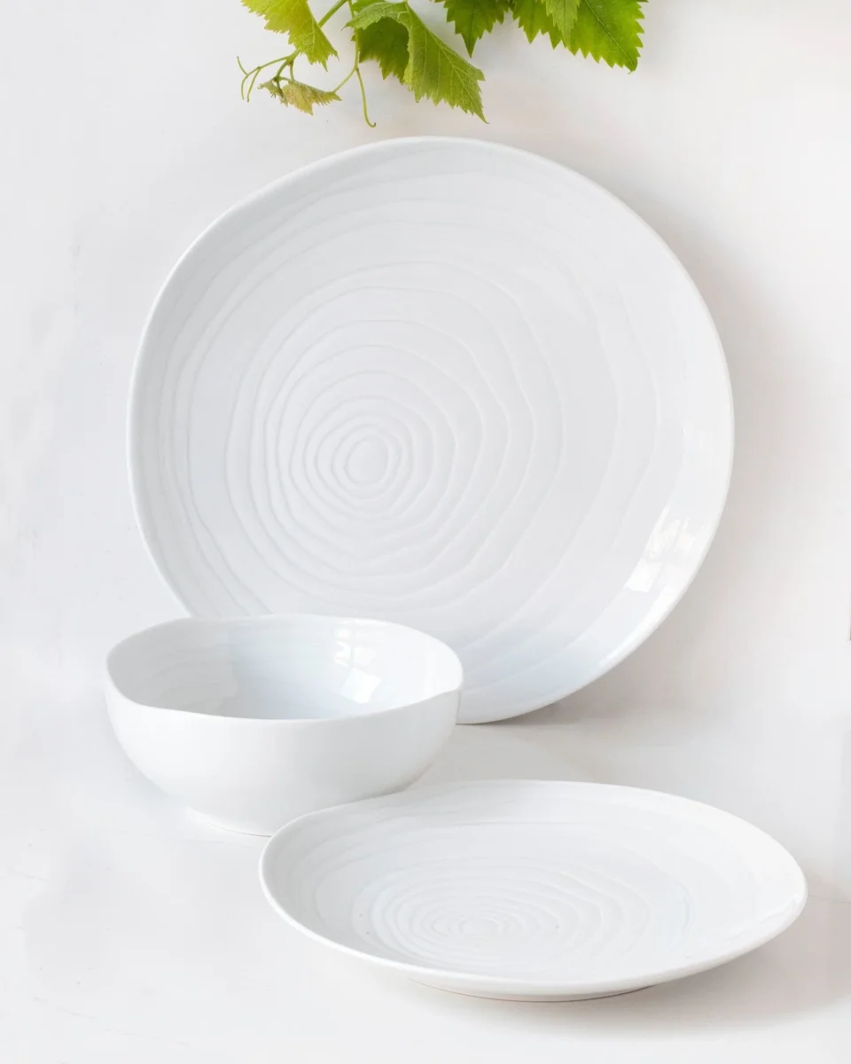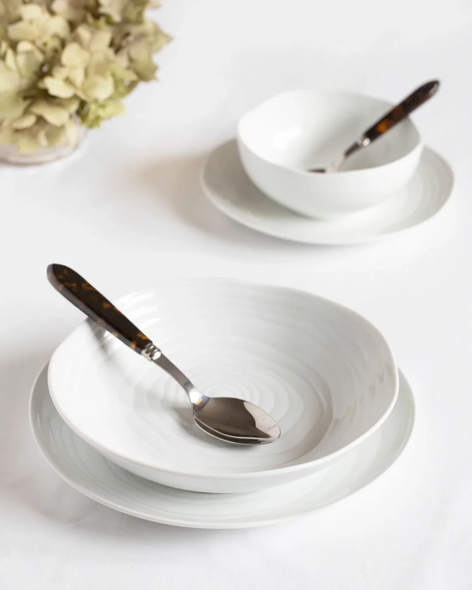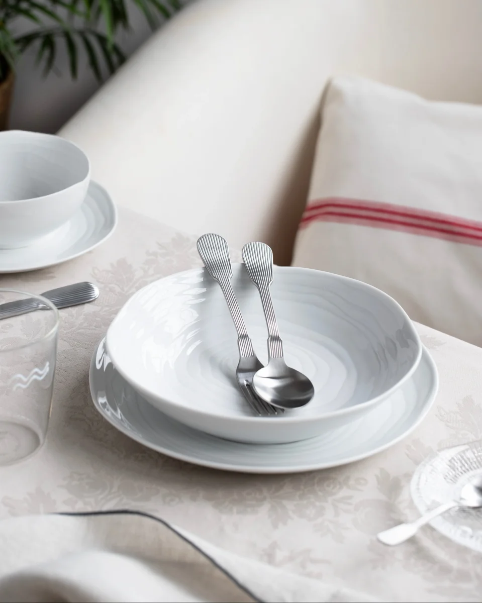 Ontwerp geïnspireerd op de dwarsdoorsnede van de teakboomstam combineert de organische vormen van de verschillende stukken met ongeëvenaarde elegantie. Handgemaakt in een van de oudste porseleinserviesfabrieken van Frankrijk, het is een prachtige collectie om elk moment aan tafel aan te kleden.