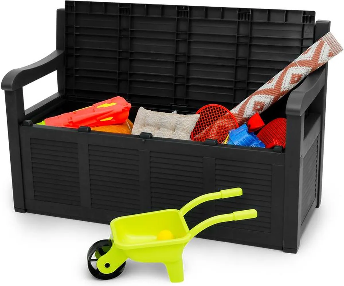 Geniet lekker van het zonnetje op dit kunststof bankje. Door z’n compacte formaat past hij ook op een klein balkon. En met de ruime opbergruimte van wel 280 liter heb je ruimte zat om bijvoorbeeld je tuinkussens of gereedschap op te bergen. Hang een slotje (exclusief) aan de klep en je kunt de opbergruimte veilig afsluiten.