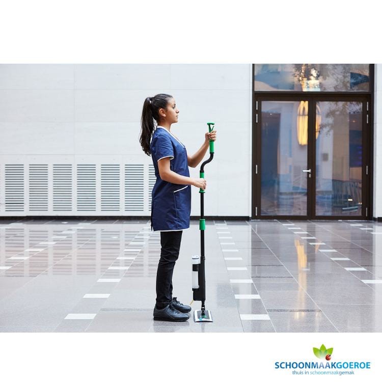 Dankzij de geïntegreerde tank van 1000 ml voor schoonmaakmiddelen, is de UNGER erGO! clean altijd klaar voor gebruik. Je hoeft geen tijd te verspillen aan het vullen van emmers met water; een simpele druk op de hendel volstaat om de juiste hoeveelheid reinigingsmiddel direct op je vloer aan te brengen. Dit bespaart niet alleen tijd, maar ook water en schoonmaakmiddel, wat weer goed is voor zowel je portemonnee als het milieu.
