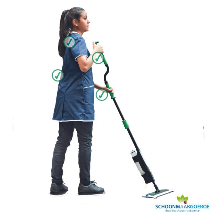 Het slimme ontwerp van de UNGER erGO! clean is speciaal ontwikkeld met jouw comfort in gedachten. De ergonomische S-vormige steel (130 – 170 cm) zet je eenvoudig vast op de meest comfortabele werkhoogte voor jou. Door deze instel mogelijkheden wordt de belasting op jouw rug, armen en polsen geminimaliseerd tijdens het schoonmaken van je vloer.