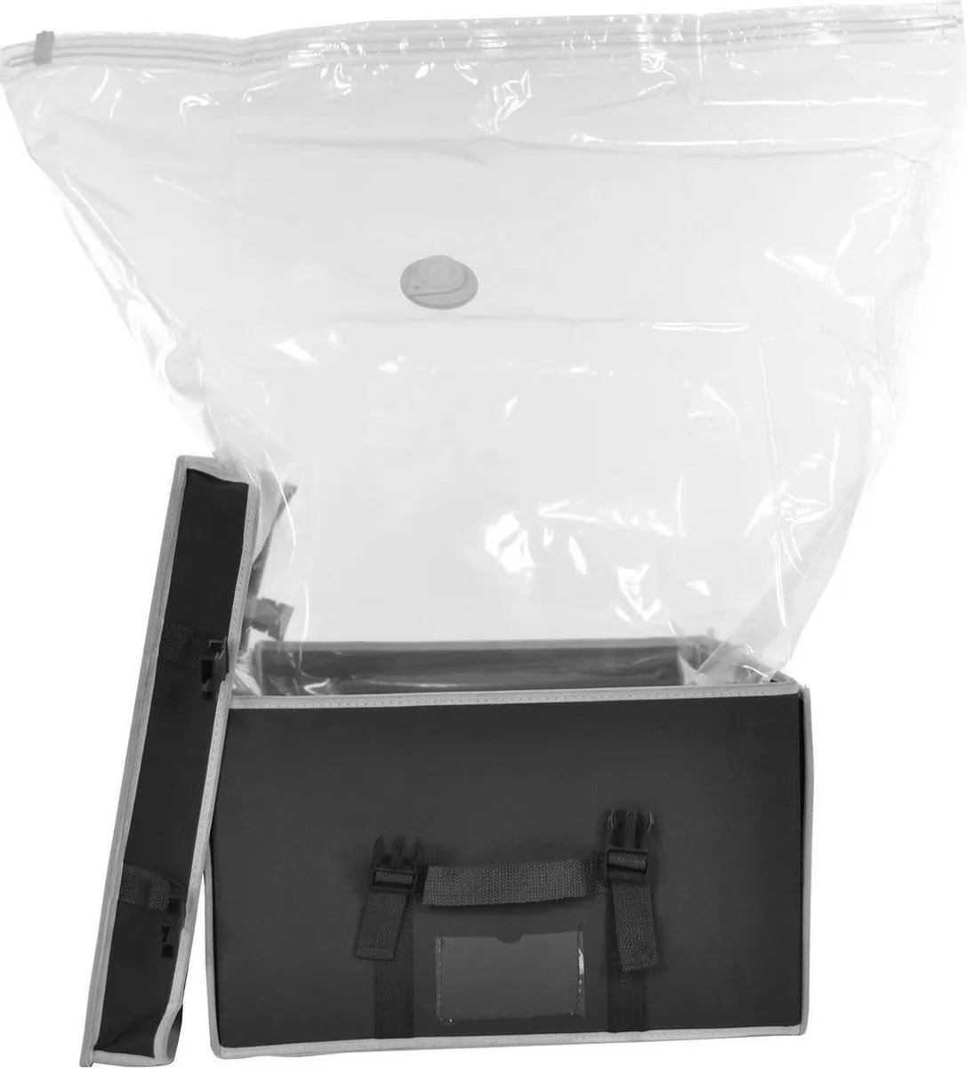 De opbergbox wordt geleverd inclusief passende vacuumzak. De box kan worden vacuum gezogen met een stofzuiger. Als je de box mee wilt nemen op reis dan kan je eventueel ook een handpompje bestellen bij Vacuumzakkenspecialist, waarmee je deze opbergbox vacuum kunt trekken.
